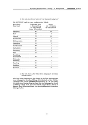 Drucksache \0/1714 Schleswig- Holsteinischer Landtag- 10. Wahlperiode 2 \Vie viele Unterrichtsstunden werden- aufgeschlüsselt nach Schul- formen und Kreisen bzw_ kreisfreien Städten - von den unter 1. genannten Lehrkräften in welchen Fächern erteilt? Die ANTWORT ergibt sich aus nachstehender Tabelle. durch Kreis/kreis- Lehrkräfte davon entfielen auf Schulart freie Stadt ohne 2. Staats- prüfung ßS BFS RAS FOS FG FS erteilte Stunden (ohne Referendare) Flensburg 452.5 177 102 44 129,5 Kiel 519 341 54 5 14 28 77 Lübeck 742 3% 183 4 14 52 93 Neumünster 563.5 30(, 158 2 ]() 68,5 19 Dithmarschen 471 296 114 26 35 Lauenburg 178 9() 61 10 8 Nordfriesland 678 51'l 123 25 II Ostholstein 442.5 259,5 170 1 12 Pinneberg 655 36(, 214 2 4 69 Plön 108 74 28 4 2 Rendsburg- Eckernförde 329 237 88 4 Schleswig- Flensburg 296 14~ 70 19 59 Scgcbcrg 453.8 371,8 62,5 19.5 Steinburg 143 127 10 6 Stormarn 278 17(, 98 4 Hinsichtlich des zweiten Teils der Frage ist eine Beantwortung nicht möglich. Eine Erhebung über die Zuordnung der Unterrichtsstunden der unter 1) genannten Lehrkräfte >U einzelnen Fächern liegt nicht vor. Im übrigen wäre eine solche Erhebung mit einem nicht vertretbaren Verwaltungsaufwand verbunden. da gemäß Fächerbezeichnungserlafl vom 31. August 1984- X 500-3259- in den berufsbildenden Schulen insgesamt 38 Fächer unterrichtet werden. Eine übersichtliche Zuord- nung zu jedem einzelnen Fach ist nicht möglich, da z. B. die Fächer Fachkunde, Fachpraxis. Fachzeichnen, fachbezogene Mathematik in allen Fachrichtungen der Berufsschule unterrichtet werden. Würde bei den einzelnen Fächern im weiteren nach der Fachrichtung differen- ziert. so wäre die Zahl der Fächer noch um ein Vielfaches höher. 4