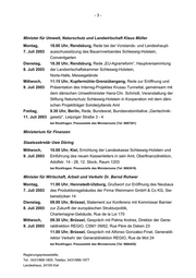 -2- Mittwoch, 10.30 Uhr, Kiel, Aushändigung des Verdienstkreuzes am Bande des 06.08.2003 Verdienstordens der Bundesrepublik Deutschland an Helmut Oeller- mann aus Geesthacht, Kreis Herzogtum Lauenburg, Innenministerium, Düsternbrooker Weg 92 11.30 Uhr, Kiel, Begrüßung von Finanzexperten aus der russischen Region Stavropol, Innenministerium, Düsternbrooker Weg 92 Donnerstag, 10.00 Uhr, Fehmarn, Besichtigung der Deichverstärkung im Rahmen 07.08.2003 der Sommerreise Küstenschutz, Treffpunkt Betriebshof Bojendorf Freitag, 10.30 Uhr, Kiel, Aushändigung des Verdienstkreuzes am Bande des 08.08.2003 Verdienstordens der Bundesrepublik Deutschland an Friedmund Wieland aus Bad Bramstedt, Kreis Segeberg, Innenministerium, Düsternbrooker Weg 92 Staatssekretär Ulrich Lorenz Dienstag, 15.00 Uhr, Ratzeburg, Übergabe Bewilligungsbescheid „Umbau vor- 05.08.2003 handener Gewerbeimmobilie zur neuen Feuerwache“, Ratsaal des Rathauses, Unter den Linden 1 Freitag, 09.00 Uhr, Tönning, Übergabe Sonderbedarfszuweisung 2. Bauab- 07.08.2003 schnitt Tönninger Badestrandkonzept, Rathaus, Sitzungssaal, Am Markt 1 14.20 Uhr, Flensburg, Übergabe Bewilligungsbescheid Förderpro- gramm „Walzenmühle“, Neustadt 16 bei Rückfragen: Pressestelle des Ministeriums (Tel: 9883007) Minister für Umwelt, Naturschutz und Landwirtschaft Klaus Müller Mittwoch, 14.00 Uhr, Wahlstedt (Kreis Segeberg), Besichtigung des Verpa- 06.08.2003 ckungsbetriebes Rexam-Glas mit Landtagsabgeordnete Astrid Höfs, Dr. Hermann-Lindrath-Straße 21 Freitag, 10.00 Uhr, Kappeln, Kontrollfahrt Fischereiaufsicht auf der Schlei, 08.08.2003 Barkasse im Hafen Sonntag, 18.15 Uhr, Daldorf (Kreis Segeberg), Festansprache zum Schmet- 10.08.2003 terlingsfest, Erlebniswald Trappenkamp, bei Rückfragen: Pressestelle des Ministeriums (Tel: 9887201) Minister für Finanzen Dr. Ralf Stegner Montag, 16.00 Uhr, Hamburg, Eröffnung der Bucerius Summer School on 04.08.2003 Global Governance 2003, Hamburger Rathaus, Kaisersaal Mittwoch, 19.00 Uhr, Bordesholm, Eröffnung der Ausstellung „Das europäische 06.08.2003 Haus“, Verwaltungsschule, Heintzestraße 13 bei Rückfragen: Pressestelle des Ministeriums (Tel: 9883919)