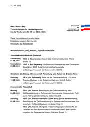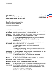 31. Juli 2003 Pressestelle Wer - Wann - Wo - der Terminkalender der Landesregierung Landesregierung Schleswig-Holstein für die Woche vom 04.08. bis 10.08. 2003 Diese Terminübersicht ersetzt keine Einladung, sondern dient nur als Hinweis für die Redaktionen Ministerium für Justiz, Frauen, Jugend und Familie Staatssekretärin Mathilde Diederich Donnerstag, 10.00 h, Neumünster, Besuch des Kinderschutzbundes, Plöner 07.08.2003 Straße 23, Sonnabend, 13.00 h, Bad Segeberg, Grußwort zur Veranstaltung des Christopher- 09.08.2003 Street-Days 2003, Ecke Kirchstraße/Kurhausstraße bei Rückfragen: Pressestelle des Ministeriums (Tel: 9883706) Ministerin für Bildung, Wissenschaft, Forschung und Kultur Ute Erdsiek-Rave Sonntag, 14.30 Uhr, Schleswig, Rede bei der Festveranstaltung 125 Jahre 10.08 2003 Thaulow-Museum in der Gotischen Halle von Schloß Gottorf bei Rückfragen: Pressestelle des Ministeriums (Tel: 9885805) Innenminister Klaus Buß Montag, 10.00 Uhr, Husum, Besichtigung der Deichverstärkung Neu- 04.08.2003 feld/Neufelderkoog im Rahmen der Sommerreise Küstenschutz, Treff- punkt Amt für Ländliche Räume, Hafen Neufeld Dienstag, 10.00 Uhr, Friedrich-Wilhelm-Lübke-Koog (Kreis Nordfriesland), 05.08.2003 Besichtigung der Deichverstärkung im Rahmen der Sommerreise Küs- tenschutz, Treffpunkt Baubüro Horsbüller Weg 91 14.30 Uhr, Husum, Übergabe eines Bewilligungsbescheides für ein Darlehen aus dem Kommunalen Investitionsfonds für den Erweite- rungsbau der Feuerwache Husum, Rathaus, Zingel 10
