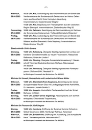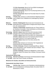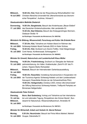 -3- 11.15 Uhr, Neumünster, Besuch bei Firma EDEKA Handelsgesell- schaft Nord mbH, Gadelander Straße 120 14.30 Uhr, Neumünster, Besuch bei Firma Neumag GmbH & Co. KG, Christianstraße 168-170 15.30 Uhr, Neumünster, Besuch bei Firma Satori Stock-Tec, Rends- burger Straße 93 Dienstag, 11.00 Uhr, Kiel, Grußwort zur außerordentlichen Mitgliederversamm- 15. Juli 2003 lung Pro Baltica Forum, Gästehaus der Landesregierung, Niemans- weg 78 Mittwoch, 10.00 Uhr, Weddingstedt, Besuch des neuen Druckzentrums der 16. Juli 2003 Westholsteinischen Verlagsanstalt & Verlagsdruckerei Boyens GmbH & Co. KG, Industriestraße 1 14.00 Uhr, Friedrichstadt, Gesprächsrunde zum Thema Verkehr an der Westküste (Veranstalter: Kreise Nordfriesland und Dithmarschen), Hotel Aquarium, Am Mittelburgwall 4 - 8 Donnerstag, 10.00 Uhr, Lübeck, Besuch bei Firma A3D international GmbH 17. Juli 2003 (Übergabe eines Zuwendungsbescheides), Breite Straße 6 - 8 11.45 Uhr, Lübeck, Besuch bei Firma MACH AG, Wielandstraße 14 14.30 Uhr, Lübeck, Besuch bei Firma Nordischer Maschinenbau Rud. Baader GmbH & Co. KG, Geniner Straße 249 16.15 Uhr, Lübeck, Besuch bei Firma Hans Lehmann KG, Luisenhof 13 18.30 Uhr, Kiel, Grußwort zum Community Treff, Freigelände der Fachhochschule Kiel, Schwentinemündung Sonntag, 11.00 Uhr, Schleswig, Teilnahme Ausstellungseröffnung „Stephen 20. Juli 2003 Conroy Retrospektive“ (unter Teilnahme des Earls of Wessex - Prinz Edward), Schloss Gottorf 12.30 Uhr, Schleswig, Teilnahme am Mittagessen zu Ehren seiner Königlichen Hoheit Prinz Edward, Earl of Wessex, Hirschsaal, Schloss Gottorf Staatssekretär Wilfried Voigt Donnerstag, Alberdorf und Husum, Sommerreise der Ministerpräsidentin, Beglei- 17. Juli 2003 tung zu den Firmen Farmatic und REpower Ministerium für Soziales, Gesundheit und Verbraucherschutz Staatssekretär Horst-Dieter Fischer Freitag, 14.00 Uhr, Kiel, Teilnahme an der Ordentlichen Aufsichtsratssitzung 18. Juli 2003 des Universitätsklinikums Schleswig-Holstein, Brunswiker Straße 10, Seminarraum (4. Stock)