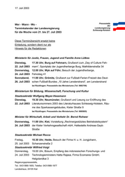 17. Juli 2003 Pressestelle Wer - Wann - Wo - der Terminkalender der Landesregierung Landesregierung Schleswig-Holstein für die Woche vom 21. bis 27. Juli 2003 Diese Terminübersicht ersetzt keine Einladung, sondern dient nur als Hinweis für die Redaktionen Ministerin für Justiz, Frauen, Jugend und Familie Anne Lütkes Dienstag, 17.30 Uhr, Burg auf Fehmarn, Grußwort zum „Day of Culture Feh- 22. Juli 2003 marn“, Sportplatz der Jugendherberge Burg, Mathildenstraße 34 Donnerstag, 12.00 Uhr, Wyk auf Föhr, Besuch der Jugendherberge, 24. Juli 2003 Fehrstieg 41 Sonnabend, 11.00 Uhr, Grömitz, Grußwort zur Fußball-Ferien-Freizeit des Deut- 26. Juli 2003 schen Fußball-Bundes „10 Jahre Lensterstrand“, am Lensterstrand bei Rückfragen: Pressestelle des Ministeriums (Tel: 9883706) Ministerium für Bildung, Wissenschaft, Forschung und Kultur Staatssekretär Wolfgang Meyer-Hesemann Dienstag, 19.30 Uhr, Neumünster, Grußwort und Lesung zur Eröffnung des 22. Juli 2003 Literatursommers 2003 des Literaturhauses Schleswig-Holstein, Räu- me des Sparkassengebäudes, Kieler Straße 9 bei Rückfragen: Pressestelle des Ministeriums (Tel: 9885805) Minister für Wirtschaft, Arbeit und Verkehr Dr. Bernd Rohwer Donnerstag, 11.00 Uhr, Kiel, Vorstellung „Rechnergestütztes Betriebsleitsystem“ 24. Juli 2003 der Kieler Verkehrsgesellschaft mbH, Haltestelle Andreas-Gayk- Straße Staatssekretär Michael Rocca Freitag, 10.30 Uhr, Heide, Besuch der Firma H. u. H. Jungjohann, 25. Juli 2003 Schanzenstraße 2 Staatssekretär Wilfried Voigt Donnerstag, 19.00 Uhr, Büsum, Empfang des indonesischen Forschungs- und 24. Juli 2003 Technologieministers Hatta Rajasa, Firma Ecomares GmbH, Helgolandkai 3 Regierungspressestelle, Tel.: 0431/988-1805, Telefax: 0431/988-1977 Landeshaus, 24105 Kiel