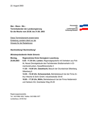 22. August 2003 Pressestelle Wer - Wann - Wo - der Terminkalender der Landesregierung Landesregierung Schleswig-Holstein für die Woche vom 25.08. bis 31.08. 2003 Diese Terminübersicht ersetzt keine Einladung, sondern dient nur als Hinweis für die Redaktionen Nachmeldung! Nachmeldung! Ministerpräsidentin Heide Simonis Montag, Regionalreise Kreis Herzogtum Lauenburg 25.08.2003 9.30 - 11.30 Uhr, Lanken, Regionalgespräche mit Vertretern aus Poli- tik, Neues Dienstgebäude des Fachdienstes Straßenverkehr in El- menhorst/Lanken, Kesselflickerstraße 2 11.30 – 14.00 Uhr, Geesthacht, Besuch der Grundschule Silberberg, Silberberg 6 14.30 – 15.30 Uhr, Schwarzenbek, Betriebsbesuch bei der Firma Ar- thur Hitscher & Sohn GmbH, Industriestraße 38-40 16.00 – 17.30 Uhr, Mölln, Betriebsbesuch bei der Firma Heidenreich und Harbeck AG, Grambeker Weg 25-29 Regierungspressestelle, Tel.: 0431/988-1805, Telefax: 0431/988-1977 Landeshaus, 24105 Kiel
