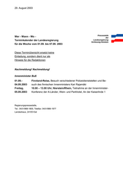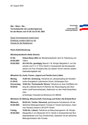29. August 2003 Pressestelle Wer - Wann - Wo - der Terminkalender der Landesregierung Landesregierung Schleswig-Holstein für die Woche vom 01.09. bis 07.09. 2003 Diese Terminübersicht ersetzt keine Einladung, sondern dient nur als Hinweis für die Redaktionen Nachmeldung! Nachmeldung! Innenminister Buß 01.09.- Finnland-Reise, Besuch verschiedener Polizeidienststellen und Be- 04.09.2003 such des finnischen Innenministers Kari Rajamäki Freitag, 10.00 – 13.00 Uhr, Nierstein/Rhein, Teilnahme an der Innenminister- 05.09.2003 Konferenz der A-Länder, Wein- und Parkhotel, An der Kaiserlinde 1 Regierungspressestelle, Tel.: 0431/988-1805, Telefax: 0431/988-1977 Landeshaus, 24105 Kiel