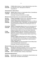 -2- Samstag, 11.00 Uhr, Kiel, Grußwort zur Tagung „Migrantenkinder an den Schu- 06.09.2003 len: Erfolg oder Frust!“, Bildungszentrum Mettenhof, Vaasastraße 43 Staatssekretär Dr. Hellmut Körner Sonnabend 19.00 Uhr, Kiel, Grußwort zur Interkulturellen Woche, Veranstaltungs- 13.09.2003 zentrum Räucherei, Preetzer Straße bei Rückfragen: Pressestelle des Ministeriums (Tel: 9885805) Minister für Umwelt, Naturschutz und Landwirtschaft Klaus Müller Dienstag, 17.00 Uhr, Schmalfeld, Grußwort bei der Besichtigung des Schwei- 02.09.2003 nemastbetriebes Göttsch, Kaltenkirchener Straße 26 Mittwoch, 14.00 Uhr, Mildstedt (Kreis Nordfriesland), Grußwort zur Eröffnung 03.09.2003 der Wanderwerkstatt „Vögel im Nationalpark“ des Nationalparkamtes schleswig-holsteinisches Wattenmeer, Kirchenweg 6b, Grund- und Hauptschule Donnerstag, 18.00 Uhr, Timmendorfer Strand, Rede bei der Klausurtagung „Auf 04.09.2003 den Spuren der Hanse“ des Deutschen LandFrauenverbandes, an Bord der Hanseat II, Seebrücke vor Hotel Seeschlösschen. Schifffahrt entlang der Lübecker Bucht und Trave nach Lübeck, Drehbrücke Freitag, 10.30 Uhr, Elmshorn, Rede beim Pilotprojekt zur Einführung einer 05.09.2003 begleitenden landwirtschaftlichen Grundwasserschutzberatung für Wasserschutzgebiete in Schleswig-Holstein, Betrieb Landwirt Pump, Lerchenstraße 71 15.45 Uhr, Lübeck, Empfang, Besuch Prinz Henrik von Dänemark zum Lebensmittelseminar der Ernährungs- und Landwirtschaftsabtei- lung der Königlich Dänischen Botschaft Berlin, Kaufmannschaft zu Lübeck, Breite Straße 6-18 17.00 Uhr, Molfsee, Rede beim Sommerfest 25 Jahre Stiftung Natur- schutz Schleswig-Holstein, Eschenbrook 4 bei Rückfragen: Pressestelle des Ministeriums (Tel: 9887201) Minister für Wirtschaft, Arbeit und Verkehr Dr. Bernd Rohwer Montag, Ganztägig, St. Petersburg, Russland, Teilnahme an der Delegati- 01.09.2003 onsreise der Ministerpräsidentin (bis Mittwoch, 03.09.2003) Freitag, 10.00 Uhr, Rendsburg, Rede zur Fachveranstaltung „Die Zukunft des 05.09.2003 ÖPNV in Schleswig-Holstein, Kreishaus, Kaiserstraße 8 Staatssekretär Michael Rocca Dienstag 9.30 Uhr, Kiel, Grußwort zur 3. Internationalen U-Boot-Konferenz (die 02.09.2003 SubCon) 2003, Hotel Maritim, Bismarckallee 2