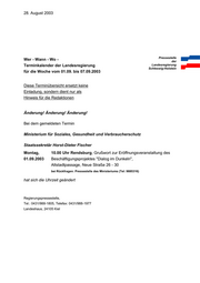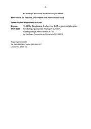 -3- Bei Rückfragen: Pressestelle des Ministeriums (Tel. 9884420) Ministerium für Soziales, Gesundheit und Verbraucherschutz Staatssekretär Horst-Dieter Fischer Montag, 10.00 Uhr Rendsburg, Grußwort zur Eröffnungsveranstaltung des 01.09.2003 Beschäftigungsprojektes "Dialog im Dunkeln", Altstadtpassage, Neue Straße 26 - 30 bei Rückfragen: Pressestelle des Ministeriums (Tel: 9885316) Regierungspressestelle, Tel.: 0431/988-1805, Telefax: 0431/988-1977 Landeshaus, 24105 Kiel