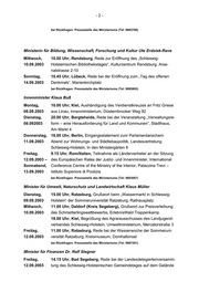 -2- bei Rückfragen: Pressestelle des Ministeriums (Tel: 9883706) Ministerin für Bildung, Wissenschaft, Forschung und Kultur Ute Erdsiek-Rave Mittwoch, 10.00 Uhr, Rendsburg, Rede zur Eröffnung des „Schleswig- 10.09.2003 Holsteinischen Bibliothekstages“, Kulturzentrum Rendsburg, Arse- nalstrasse 2-10 Sonntag, 10.45 Uhr, Lübeck, Rede bei der Eröffnung zum „Tag des offenen 14.09.2003 Denkmals“, Marienkirchplatz bei Rückfragen: Pressestelle des Ministeriums (Tel: 9885805) Innenminister Klaus Buß Montag, 10.00 Uhr, Kiel, Aushändigung des Verdienstkreuzes an Fritz Griese 08.09.2003 aus Linau, Innenministerium, Düsternbrooker Weg 92 Dienstag, 20.00 Uhr, Bargteheide, Rede bei der Veranstaltung „Verwaltungsre- 09.092003 form – eine Herausforderung für Land und Kommunen“, Stadthaus, Am Markt 4 Donnerstag, 18.00 Uhr, Berlin, Eingangsstatement zum Parlamentarischern 11.09.2003 Abend zur Wohnungs- und Städtebaupolitik, Landesvertretung Schleswig-Holstein, In den Ministergärten 8 Freitag, 9.15 Uhr, Rom/Italien, Teilnahme als Ländervertreter an der Sitzung 12.09.2003 – des Europäischen Rates der Justiz- und Innenminister, International Sonnabend, Conference Centre of the Ministry of the Interior, Palazzina Trevi – 13.09.2003 Istituto Superiore di Poolizia bei Rückfragen: Pressestelle des Ministeriums (Tel: 9883007) Minister für Umwelt, Naturschutz und Landwirtschaft Klaus Müller Dienstag, 15.00 Uhr, Ratzeburg, Grußwort beim „Wassermarkt in Schleswig- 09.09.2003 Holstein“ der Sommeruniversität Ratzeburg, Rathausplatz Mittwoch, 11.00 Uhr, Daldorf (Kreis Segeberg), Grußwort zur Preisverleihung 10.09.2003 des Schmetterlingswettbewerbs, ErlebnisWald Trappenkamp 18.00 Uhr, Kiel, Begrüßung des Agrarausschusses des Landjugend- verbandes Schleswig-Holstein, Umweltministerium, Mercatorstraße 3 Freitag, 11.00 Uhr, Ratzeburg, Rede bei der Wasserwoche der Sommeruni- 12.09.2003 versität Ratzeburg, Kreismuseum, Domhalbinsel bei Rückfragen: Pressestelle des Ministeriums (Tel: 9887201) Minister für Finanzen Dr. Ralf Stegner Freitag, 14.15 Uhr, Bad Segeberg, Rede bei der Landesdelegiertenversamm- 12.09.2003 lung des Schleswig-Holsteinischen Gemeindetages auf dem Gelände