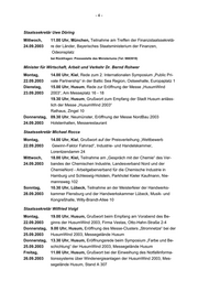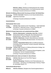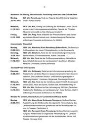 -2- 20.00 Uhr, Lübeck, Teilnahme am Abschlusskonzert des Landesju- gendorchesters Schleswig-Holstein in der Musikhochschule Lübeck bei Rückfragen: Pressestelle des Ministeriums (Tel: 9883706) Ministerin für Bildung, Wissenschaft, Forschung und Kultur Ute Erdsiek-Rave Donnerstag, 13.30 Uhr, Darmstadt, Teilnahme an der Kultusministerkonferenz, 09.10.2003 Jagdschloss Kranichstein bei Rückfragen: Pressestelle des Ministeriums (Tel: 9885805) Innenministerium Staatssekretär Ulrich Lorenz Freitag, 14.00 Uhr, Kiel, Grußwort auf der Veranstaltung „1. Kieler Multimedia 10.10.2003 Zukunftsforum“, Multimedia Campus, Theodor-Heuß-Ring 140 bei Rückfragen: Pressestelle des Ministeriums (Tel: 9883007) Minister für Umwelt, Naturschutz und Landwirtschaft Klaus Müller Montag, 10.00 Uhr, Marienwarder / Lehmkuhlen, Kreis Plön, Grußwort 06.10.2003 Obstbaubetrieb Wolff zum Pilotprojekt „Öko-Obstbauberatung in Norddeutschland“, Gärtnerhof Peter und Christiana Wolff Mittwoch, 15.00 Uhr, Kellenhusen, Grußwort „Naturerlebnisraum Gemeinde 08.10.2003 Kellenhusen“, Kurverwaltung, Strandpromenade / Am Ende der Kir- schenallee 17.00 Uhr, Timmendorfer Strand, Rede zur Eröffnung Deutscher Fischereitag 2003 des Deutschen Fischerei-Verbandes, Maritimhotel, An der Waldkapelle Donnerstag, 11.00 Uhr, Kiel, Grußwort zur Eröffnung Dithmarscher Kohltage, Hol- 09.10.2003 stentörn, Sophienblatt, Karstadt 16.30 Uhr, Lunden, Rede zur Ausweisung Naturschutzgebiet „Lunde- ner Niederung“, Amt KLG, Nordbahnhofstraße 7 bei Rückfragen: Pressestelle des Ministeriums (Tel: 9887201) Minister für Wirtschaft, Arbeit und Verkehr Dr. Bernd Rohwer Mittwoch, 14.00 Uhr, Kiel, Besuch bei Firma PEGA Pegasus 08.10.2003 An der Schanze 51 19.00 Uhr, Ahrensburg, Teilnahme an der Podiumsdiskussion „Zu- kunft meistern – Ahrensburg in der Metropolregion Hamburg“, Ringho- tel, Ahrensfelder Weg 48 - 50 Staatssekretär Michael Rocca Mittwoch, 10.00 Uhr, Elmshorn, Übergabe eines Zuwendungsbescheides an