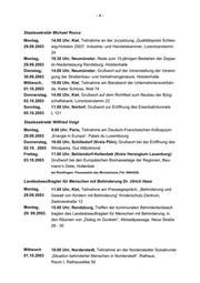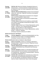 -3- Dienstag, 16.00 Uhr, Kiel, Rede beim Workshop „Energetische Nutzung von 30.09.2003 Anbaubiomasse“, in Zusammenarbeit des Umweltministeriums und der Akademie für Natur und Umwelt, Kopperpahler Allee 69, Bürger- haus Kronshagen Freitag, 16.00 Uhr, Gleschendorf/Scharbeutz, Grußwort auf der Fachmesse 03. 10.2003 „Gutes Land – gute Leute“, Regionale Vermarktung, Industriegebiet, Otto-Kipp-Straße 1 Sonntag, 9.45 Uhr, Husum, Entgegennahme der Erntekrone der Landjugend 05.10.2003 Leck, vor dem Kirchenportal St. Marien-Kirche 10.00 Uhr, Husum, Predigt zum ökumenischen Erntedank-Gottes- dienst, St. Marien-Kirche 11.30 Uhr, Husum, Grußwort bei der Ausstellung „Landwirtschaftli- cher Lehrpfad“ und Präsentation Ernteprodukte der Region, St. Ma- rien-Kirche, Marktplatz 14.30 Uhr, Preetz, Grußwort zum 5. Preetzer Regionalmarkt „nachhal- tig leben – mit genuss“ und zur Wanderausstellung „Ökologischer Landbau“, Haus der Diakonie, Am Alten Amtsgericht 5 15.00 Uhr, Preetz, Besuch des 5. Preetzer Regionalmarktes „nachhal- tig leben – mit genuss“, Marktplatz bei Rückfragen: Pressestelle des Ministeriums (Tel: 9887201) Minister für Finanzen Dr. Ralf Stegner Freitag, 12.30 Uhr, Magdeburg, Vertretung der Ministerpräsidentin zum Tag 03.10.2003 der Deutschen Einheit, Festakt in der Stadthalle Magdeburg bei Rückfragen: Pressestelle des Ministeriums (Tel: 9883919) Minister für Wirtschaft, Arbeit und Verkehr Dr. Bernd Rohwer Montag, 9.00 Uhr, Kronshagen, Grußwort zur Fachtagung „Radverkehr in 29.09.2003 Schleswig-Holstein – Fahrrad und Tourismus“, Bürgerhaus Kronsha- gen, Kopperpahler Allee 69 Dienstag, 14.00 Uhr, Ratzeburg (Kreis Herzogtum Lauenburg), Grußwort zum 30.09.2003 1. Spatenstich Harmsdorfer Kreuz, Harmsdorfer Kreuz (Kreuzung B207/B208) Mittwoch, 10.30 Uhr, Rendsburg, Grußwort zur Informationsveranstaltung des 01.10.2003 Tourismusverbandes und des Deutschen Tourismusverbandes „Die DTV-Klassifizierung – Neuerungen für Schleswig-Holstein“, Kulturzent- rum Rendsburg, Arsenalstraße 2-10 Donnerstag, 10.30 Uhr, Kiel, Aushändigung des Verdienstkreuzes am Bande des 02.10.2003 Verdienstordens der Bundesrepublik Deutschland an Professor Dr. Ing. Hans Weinerth, aus Dassendorf, Ministerium für Wirtschaft, Arbeit und Verkehr, Düsternbrooker Weg 94, kleiner Sitzungssaal