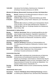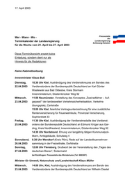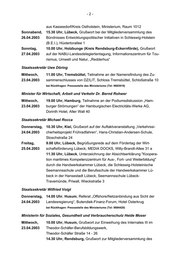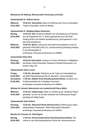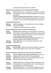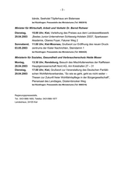 -3- bände, Seehotel Töpferhaus am Bistensee bei Rückfragen: Pressestelle des Ministeriums (Tel: 9883919) Minister für Wirtschaft, Arbeit und Verkehr Dr. Bernd Rohwer Dienstag, 15.00 Uhr, Kiel, Verleihung des Preises aus dem Landeswettbewerb 29.04.2003 „Bestes Junior-Unternehmen Schleswig-Holstein 2003“, Sparkassen Akademie, Oberes Foyer, Faluner Weg 2 Sonnabend, 11.00 Uhr, Kiel-Moorsee, Grußwort zur Eröffnung des neuen Druck- 03.05.2003 zentrums der Kieler Nachrichten, Steindamm 1 bei Rückfragen: Pressestelle des Ministeriums (Tel: 9884420) Ministerin für Soziales, Gesundheit und Verbraucherschutz Heide Moser Montag, 13.30 Uhr, Rendsburg, Besuch des Mischfutterwerkes der Raiffeisen 28.04.2003 Hauptgenossenschaft Nord AG, Am Kreishafen 27 – 31 Dienstag, 17.00 Uhr, Kiel, Grußwort zur Veranstaltung des Deutschen Paritäti- 29.04.2003 schen Wohlfahrtsverbandes, “So wie es geht, geht es nicht weiter – Thesen zur Zukunft freier Wohlfahrtspflege in der Bürgergesellschaft”, Plenarsaal des Landtages, Düsternbrooker Weg bei Rückfragen: Pressestelle des Ministeriums (Tel: 9885316) Regierungspressestelle, Tel.: 0431/988-1805, Telefax: 0431/988-1977 Landeshaus, 24105 Kiel