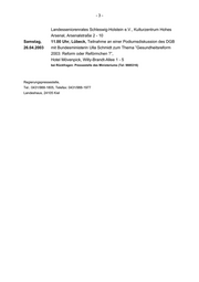 -3- Landesseniorenrates Schleswig-Holstein e.V., Kulturzentrum Hohes Arsenal, Arsenalstraße 2 - 10 Samstag, 11.00 Uhr, Lübeck, Teilnahme an einer Podiumsdiskussion des DGB 26.04.2003 mit Bundesministerin Ulla Schmidt zum Thema ”Gesundheitsreform 2003: Reform oder Reförmchen ?”, Hotel Mövenpick, Willy-Brandt-Allee 1 - 5 bei Rückfragen: Pressestelle des Ministeriums (Tel: 9885316) Regierungspressestelle, Tel.: 0431/988-1805, Telefax: 0431/988-1977 Landeshaus, 24105 Kiel