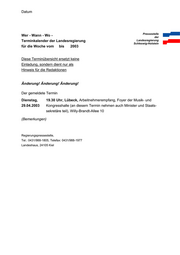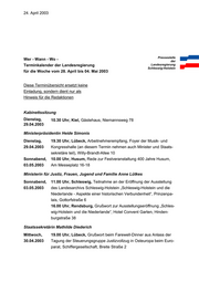 Datum Pressestelle Wer - Wann - Wo - der Terminkalender der Landesregierung Landesregierung Schleswig-Holstein für die Woche vom bis 2003 Diese Terminübersicht ersetzt keine Einladung, sondern dient nur als Hinweis für die Redaktionen Änderung! Änderung! Änderung! Der gemeldete Termin Dienstag, 19.30 Uhr, Lübeck, Arbeitnehmerempfang, Foyer der Musik- und 29.04.2003 Kongresshalle (an diesem Termin nehmen auch Minister und Staats- sekretäre teil), Willy-Brandt-Allee 10 (Bemerkungen) Regierungspressestelle, Tel.: 0431/988-1805, Telefax: 0431/988-1977 Landeshaus, 24105 Kiel