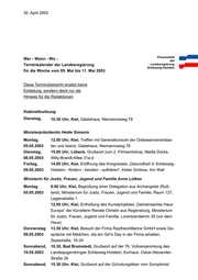 30. April 2003 Pressestelle Wer - Wann - Wo - der Terminkalender der Landesregierung Landesregierung Schleswig-Holstein für die Woche vom 05. Mai bis 11. Mai 2003 Diese Terminübersicht ersetzt keine Einladung, sondern dient nur als Hinweis für die Redaktionen Kabinettssitzung Dienstag, 10.30 Uhr, Kiel, Gästehaus, Niemannsweg 78 Ministerpräsidentin Heide Simonis Montag, 12.00 Uhr, Kiel, Treffen mit Generalkonsuln der Ostseeanrainerstaa- 05.05.2003 ten und Island, Gästehaus, Niemannsweg 78 Dienstag, 15.00 Uhr, Lübeck, Grußwort zum 2. Filmworkshop, Media Docks, 06.05.2003 Willy-Brandt-Allee 31a-d Freitag, 14.00 Uhr, Kiel, Eröffnung des Kongresses „Gesundheit in Schleswig- 09.05.2003 Holstein - fördern - beraten - aufklären“, Kieler Schloss, Am Wall Ministerin für Justiz, Frauen, Jugend und Familie Anne Lütkes Montag 9.00 Uhr, Kiel, Begrüßung einer Delegation aus Archangelsk (Ruß- 05.05.2003 land), Ministerium für Justiz, Frauen, Jugend und Familie, Raum 127, Legienstraße 1 12.00 Uhr, Kiel, Enthüllung des Kunstprojektes „Gemeinsames Haus Europa“ der Künstlerin Renate Christin aus Regensburg, Ministerium für Justiz, Frauen, Jugend und Familie, Lorentzendamm 35 (vor dem Haus) Donnerstag 13.30 Uhr, Kiel, Besuch der Firma RaytheonMarine GmbH sowie Ge- 08.05.2003 spräche mit Mädchen, die am Girl’s Day in der Firma arbeiten, Zeyestraße. 16-24 Sonnabend, 10.30, Bad Bramstedt, Grußwort auf der 76. Vollversammlung des 10.05.2003 Landesjugendringes Schleswig-Holstein, Kurhaus, Oskar-Alexander- Straße 26 Sonnabend, 15.30 Uhr, Kiel, Grußwort auf der Gründungsfeier vom Soroptimist