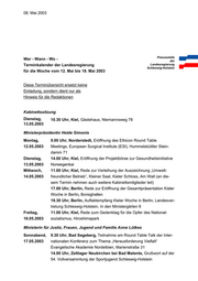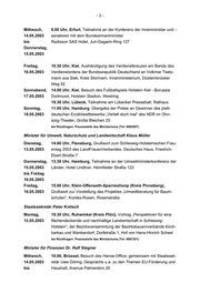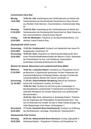 -4- soziale Gerechtigkeit gestalten”, Ostseehotel, Seeuferweg 10 Staatssekretär Horst-Dieter Fischer Freitag, 10.00 Uhr, Berlin, Teilnahme an der A-Länder-Staatssekretär- 09.05.2003 konferenz, Landesvertretung Nordrhein-Westfalen, Hiroshimastraße 12-16 bei Rückfragen: Pressestelle des Ministeriums (Tel: 9885316) Regierungspressestelle, Tel.: 0431/988-1805, Telefax: 0431/988-1977 Landeshaus, 24105 Kiel