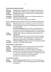 -2- 22.05.2003 renz, Hotel Nestor, Stuttgarter Straße 53 bei Rückfragen: Pressestelle des Ministeriums (Tel: 9883706) Ministerin für Bildung, Wissenschaft, Forschung und Kultur Ute Erdsiek-Rave Mittwoch, 14.00 Uhr, Flensburg, Rede zur Eröffnung der Tagung mittelstädti- 21.05.2003 scher Volkshochschulen des Deutschen Volkshochschulverbandes und Verabschiedung des Vorsitzenden des Landesverbandes, Werner Hutterer, vhs-Zentrum, Raum 18, Süderhofenden 40/42 Freitag, 19.30 Uhr, Wesselburen, Grußwort zur Brahmspreisverleihung in der 23.05.2003 Bartholomäuskirche Wesselburen Samstag, 15.00 Uhr, Kiel, Grußwort zur Eröffnung der Retrospektive von Asger 24.05. Jorn in Anwesenheit der Königlichen Hoheit Prinzessin Benedikte zu Dänemark, Kunsthalle, Düsternbrooker Weg 1 Staatssekretär Dr. Hellmut Körner Dienstag, 19.00 Uhr, Neumünster, Grußwort zur Ausstellungseröffnung „Fotofo- 20.05.2003 rum“ der Zentrale der Volksbanken, Am Großflecken 56-60 Donnerstag, 14.00 Uhr, Essen, Teilnahme am Wissenschaftsrat, Choreographi- 22.05.2003 sches Zentrum NRW, Bullmannaue 20 Freitag, 19.00 Uhr, Glückstadt, Grußwort zur Ausstellungseröffnung „Frische 23.05.2003 Fische“, Kunstverein Glückstadt, Palais für aktuelle Kunst Samstag, 10.00 Uhr, Kiel, Grußwort „Von der Dampfmaschine zur Brennstoff- 24.05.2003 zelle, 100 Jahre Ingenieurausbildung in Kiel“, Fachhochschule Kiel, Sokratesplatz 6 Sonntag, 19.30 Uhr, Kiel, Grußwort zum Filmfest Augenweide, Kulturelle Film- 25.05.2003 förderung, Pumpe, Haßstraße 22 Staatssekretär Dr. Wolfgang Meyer-Hesemann Dienstag, 15.00 Uhr, Harrislee, Grußwort zur Fachtagung „Sprachförderung im 20.05.2003 Vorfeld der Schule“ der Arbeitsgemeinschaft Deutsches Schleswig (ADS) in Kooperation mit dem Ministerium für Bildung, Wissenschaft, Forschung und Kultur, Zentralschule Harrislee, Alt Frösleer Weg Donnerstag, 17.30 Uhr, Kiel, Grußwort zur Preisverleihung „Kultur aktuell“ durch 22.05.2003 den Landeskulturverband und die Landesbank, Martensdamm 6 Sonnabend 14.30 Uhr, Helgoland, Siegerehrung der Marathon-Läufer des 24.05.2003 2. Helgoländer Staffel-Marathons an der Kurpromenade bei Rückfragen: Pressestelle des Ministeriums (Tel: 9885805)
