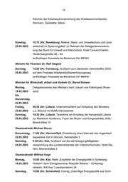 -4- Rahmen der Kreishauptversammlung des Kreisbauernverbandes Stormarn, Gaststätte „Mäcki Sonntag, 10.15 Uhr, Rendsburg, Referat „Natur- und Umweltschutz und Land- 25.05.2003 wirtschaft im Spannungsfeld“ im Rahmen der Delegiertenversamm- lung des Bund für Umwelt und Naturschutz, Hotel Convent Garten, Hindenburgstraße 38 – 42 bei Rückfragen: Pressestelle des Ministeriums (Tel: 9887201) Minister für Finanzen Dr. Ralf Stegner Sonntag, 15.20 Uhr, Flensburg, Grußwort zum dänischen Jahrestreffen 2003 25.05.2003 auf dem Festplatz Waldstraße/Marienhölzungsweg bei Rückfragen: Pressestelle des Ministeriums (Tel: 9883919) Minister für Wirtschaft, Arbeit und Verkehr Dr. Bernd Rohwer Montag, Delegationsreise des Ministers nach Litauen und Kaliningrad (Russ- 19.05.2003 land) bis Donnerstag, 22.05.2003 Freitag, 09.30 Uhr, Lübeck, Unternehmerfahrt auf Einladung des Ministers, 23.05.2003 u.a. Besuch im Multifunktionscenter Sonntag, 19.30 Uhr, Lübeck, Teilnahme am Empfang der Hansestadt Lübeck 25.05.2003 zur Maritimen Konferenz, Foyer der Musik- und Kongresshalle, Willy- Brandt-Allee 10 Staatssekretär Michael Rocca Donnerstag, 11.00 Uhr, Hörnum/Sylt, Einweihung eines Internats des Jugendauf- 22.05.2003 bauwerkes Sylt in Hörnum, Heimstraße 3 Samstag, 9.30 Uhr, Kiel, Grußwort auf der Jahrestagung/Mitglieder- 24.05.2003 versammlung des Landesverbandes der Volkshochschulen, Hotel Ma- ritim, Bismarckallee 2 Staatssekretär Wilfried Voigt Montag, 10.00 Uhr, Kiel, Rede „Eckpfeiler der Energiepolitik in Schleswig- 19.05.2003 Holstein“ beim Energieseminar Republik Belarus – Schleswig- Holstein, IHK Kiel, Lorentzendamm 24 Samstag, 10.00 Uhr, Schenefeld, Vortrag „Zukünftige Energiepolitik aus Sicht