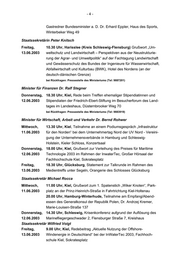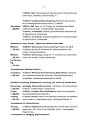 -2- 14.30 Uhr, Kiel, Abschiedsbesuch des chinesischen Generalkonsuls, Chen Yianfu, Gästehaus, Niemannsweg 78 19.00 Uhr, Gut Wensin/Raum Segeberg, Rede zum Sponsorenes- sen Schleswig-Holstein Musik-Festival, Gut Wensin Sonnabend, 9.30 Uhr, Kiel, Rede zur 119. Tagung der Norddeutschen Gesell- 14.06.2003 schaft für Gynäkologie und Geburtshilfe, Ostseehalle 12.00 Uhr, Schierensee, Eröffnung der Schierensee-Gespräche Bal- tic Media Summit, Schierensee 19.30 Uhr, Schierensee, Siegerehrung/Abschluss-Veranstaltung Bal- tic Media Summit, Schierensee Ministerin für Justiz, Frauen, Jugend und Familie Anne Lütkes Mittwoch 12.00 Uhr, Glücksburg, Empfang des Bürgermeisters der Stadt 11.06.2003 Glücksburg bei der 74. Konferenz der Justizministerinnen und - minister, Schloss Glücksburg Mittwoch 15.30 Uhr, Glücksburg, Leitung der 74. Konferenz der Justizministe- 11.06.2003 rinnen und -minister, Schloss Glücksburg bis Donners- tag 12.06.2003 Staatssekretärin Mathilde Diederich Sonnabend, 16.30 Uhr, (Mühbrook Kreis Rendsburg-Eckernförde), Teilnahme 14.06.2003 am Landesverbandstag des Deutschen Gerichtsvollzieher Bund bei Rückfragen: Pressestelle des Ministeriums (Tel: 9883706) Ministerin für Bildung, Wissenschaft, Forschung und Kultur Ute Erdsiek-Rave Donnerstag, ganztägig, Rostock-Warnemünde, Teilnahme an der Kultusminister- 12.06.2003 konferenz im Hotel Neptun, Seestraße 19 Freitag, 10.30 Uhr, Pansdorf (Kreis Ostholstein), Besuch der Integrierten 13.06.2003 Gesamtschule Eutiner Straße 16 b Sonntag, 11.30 Uhr, Husum, Rede zum Kunstprojekt „Nordkunst“ im Nordfriesi- 15.06.2003 schen Museum, Ludwig-Nissen-Haus, Herzog-Adolf-Straße 25 Staatssekretär Dr. Hellmut Körner Sonntag, 17.00 Uhr, Büdelsdorf, Eröffnungsrede der Nord-Art 2003, Kunstaus- 15.06.2003 stellung der „KiC - Kunst in der Carlshütte GmbH“, Vorwerksallee, Wagenremise, Staatssekretär Dr. Wolfgang Meyer-Hesemann