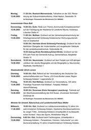 -3- Innenminister Klaus Buß Montag, 11.00 Uhr, Heide, Grußwort auf der Veranstaltung zur Stiftungsgründung 16.06.2003 „Widerstand und Verfolgung im Dritten Reich in Heide und Umgebung“, Postelheim, Markt 29 14.00 Uhr, Husum, Grußwort auf der Feier zur Erweiterung des Amtes für ländliche Räume, Herzog-Adolf-Straße 1 18.00 Uhr, Kiel, Eröffnung der Ausstellung „Kiel 2030 – Auf zu neuen Ufern“ von Studierenden der Fachhochschule Kiel, Architekten- und In- genieurkammer, Düsternbrooker Weg 71 Donnerstag, 17.00 Uhr, Glückstadt, Grußwort zur Eröffnung der Glückstädter Mat- 19.06.2003 jeswochen auf dem Marktplatz Sonnabend, 11.00 Uhr, Kiel, Grußwort auf dem Feldempfang des Verbandes der Re- 21.06.2003 servisten der Deutschen Bundeswehr, Kaserne Marinefliegergeschwa- der, Strandstraße 5 Staatssekretär Ulrich Lorenz Freitag, 19.00 Uhr, Norderstedt, Eröffnungsrede auf dem 1. Norddeutschen 20.06.2003 Sportfest 2003, Moorbekstraße Sonnabend, 10.00 Uhr, Kiel, Grußwort bei der Feierstunde des Landessportverban- 21.06.2003 des Schleswig-Holstein zur Eröffnung der Kieler Woche im Haus des Sports, Winterbeker Weg 49 bei Rückfragen: Pressestelle des Ministeriums (Tel: 9883007) Minister für Umwelt, Naturschutz und Landwirtschaft Klaus Müller Montag, 19.30 Uhr, Ellerbek (Kreis Pinneberg), Diskussionsrunde bei dem 6. 16.06.2003 Forum Ellerbek „Moderne Landwirtschaft und Verbraucherschutz: ein Widerspruch?“, Rugenbergener Mühlenweg, Kulturtreff Donnerstag, 14.00 Uhr, Kiel, Grußwort zur Informationsveranstaltung der Investiti- 19.06.2003 onsbank Schleswig-Holstein, Förderung von Umweltprojekten zu Programmen auf EU-, Bundes- und Landesebene, Ostseehalle, Europa- platz 1 Freitag, 13.00 Uhr, Kiel, Grußwort zum Auftakt der Informationskampagne „Auf 20.06.2003 zu neuen Ufern“ zur Umsetzung der EU-Wasserrahmenrichtlinie, Alter Markt, vor Nikolaikirche Staatssekretär Peter Knitsch Dienstag, 15.30 Uhr, Dannewerk (Kreis Schleswig-Flensburg), Eröffnung der 17.06.2003 Aktion „Offener Garten“ im Garten der Eheleute Eichner, Ochsenweg 17 bei Rückfragen: Pressestelle des Ministeriums (Tel: 9887201)
