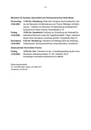 -5- Ministerin für Soziales, Gesundheit und Verbraucherschutz Heide Moser Dienstag, 16.30 Uhr, Kiel, Grußwort zur Eröffnung des DRK-Infocenters “Fit for 17.06.2003 money”, DRK Servicezentrum Mitte, Prüner Gang 15 Sonnabend, 19.00 Uhr, Norderstedt, Grußwort zur Abschlussveranstaltung des Ers- 21.06.2003 ten Norddeutschen Sportfestes für Menschen mit Behinderungen, Moor- bek-Halle Staatssekretär Horst-Dieter Fischer Montag, 15.00 Uhr, Neukirchen (Kreis Plön), Rede bei der Überreichung der 16.06.2003 Urkunde zur Anerkennung als Kurort,"Haus des Gastes", bei Rückfragen: Pressestelle des Ministeriums (Tel: 9885316) Regierungspressestelle, Tel.: 0431/988-1805, Telefax: 0431/988-1977 Landeshaus, 24105 Kiel