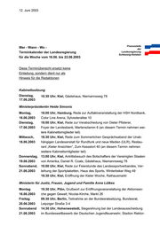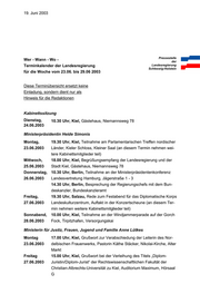 19. Juni 2003 Pressestelle Wer - Wann - Wo - der Terminkalender der Landesregierung Landesregierung Schleswig-Holstein für die Woche vom 23.06. bis 29.06 2003 Diese Terminübersicht ersetzt keine Einladung, sondern dient nur als Hinweis für die Redaktionen Kabinettssitzung Dienstag, 10.30 Uhr, Kiel, Gästehaus, Niemannsweg 78 24.06.2003 Ministerpräsidentin Heide Simonis Montag, 19.30 Uhr, Kiel, Teilnahme am Parlamentarischen Treffen nordischer 23.06.2003 Länder, Kieler Schloss, Kleiner Saal (an diesem Termin nehmen wei- tere Kabinettsmitglieder teil) Mittwoch, 18.00 Uhr, Kiel, Begrüßungsempfang der Landesregierung und der 25.06.2003 Stadt Kiel, Gästehaus, Niemannsweg 78 Donnerstag, 10.30 Uhr, Berlin, Teilnahme an der Ministerpräsidentenkonferenz 26.06.2003 Landesvertretung Hamburg, Jägerstraße 1 - 3 14.30 Uhr, Berlin, Besprechung der Regierungschefs mit dem Bun- deskanzler, Bundeskanzleramt Freitag, 19.30 Uhr, Salzau, Rede zum Festabend für das Diplomatische Korps 27.06.2003 Landeskulturzentrum, Auftakt in der Konzertscheune (an diesem Ter- min nehmen weitere Kabinettsmitglieder teil) Sonnabend, 10.00 Uhr, Kiel, Teilnahme an der Windjammerparade auf der Gorch 28.06.2003 Fock, Tirpitzhafen, Versorgungskai Ministerin für Justiz, Frauen, Jugend und Familie Anne Lütkes Montag 17.00 Uhr, Kiel, Grußwort zur Verabschiedung der Leiterin des Nor- 23.06.2003 delbischen Frauenwerks, Pastorin Käthe Stäcker, Nikolai-Kirche, Alter Markt Freitag 15.00 Uhr, Kiel, Grußwort bei der Verleihung des Titels „Diplom- 27.06.2003 Juristin/Diplom-Jurist“ der Rechtswissenschaftlichen Fakultät der Christian-Albrechts-Universität zu Kiel, Auditorium Maximum, Hörsaal G