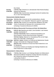 -2- Wurr-Straße Sonntag 11.00 Uhr, Kiel, Teilnahme am „Internationalen Kieler-Woche-Empfang“, 22.06.2003 Ratssaal des Rathauses 15.00 Uhr, Kiel, Anschnitt eines extralangen Kuchens für karitative Zwe- cke, vor dem Hotel Steigenberger Staatssekretärin Mathilde Diederich Donnerstag, 19.30 Uhr, Kiel, Vortrag bei der ASJ-Landeskonferenz „Aktuelle 19.06.2003 Entwicklungen in der Justizpolitik“, Restaurant Legienhof, Legienstraße Sonnabend, 10.00 Uhr, Kiel, Grußwort zum Internationalen Städteforum der Kieler 21.06.2003 Woche, Kundenhalle der Sparkasse Kiel, Lorentzendamm 28-30 bei Rückfragen: Pressestelle des Ministeriums (Tel: 9883706) Ministerin für Bildung, Wissenschaft, Forschung und Kultur Ute Erdsiek-Rave Montag, 9.00 Uhr, Kiel, Begrüßung der Aktion „Faire Schultüte“ in der Kinderta- 16.06.2003 gesstätte, Goethestraße 31 14.30 Uhr, Neumünster, Rede zur Abschlussveranstaltung zum Sinus-Programm, Aula der Klaus-Groth-Schule, Parkstraße 1 19.30 Uhr, Itzehoe, Statement zur Veranstaltung PISA und die Folgen, Rotary Club, Hotel Adler, Lindenstraße 72 Donnerstag, 20.00 Uhr, Lübeck, Grußwort zur Eröffnung des Medizinischen Fakultä- 19.06.2003 tentages, Kirchenhalle des Heiligengeist-Hospitals Freitag, 20.00 Uhr, Kiel, Teilnahme am Konzert des Kieler Knabenchors in der 20.06.2003 St. Nikolaikirche im Anschluss Grußwort zum Empfang des 35-jährigen Bestehens des Kieler Knabenchors im Kieler Kloster Staatssekretär Dr. Hellmut Körner Mittwoch, 11.00 Uhr, Kiel, Grußwort zum 40-jährigen Bestehen der Mathematisch- 18.06.2003 Naturwissenschaftlichen Fakultät der Christian-Albrechts-Universität zu Kiel, Hörsaal des Instituts für Physikalische Chemie, Ludewig-Meyn-Straße 8 bei Rückfragen: Pressestelle des Ministeriums (Tel: 9885805)