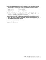 (2) Die Freie und Hansestadt Hamburg zahlt für die Jahre 1997 bis 1999 folgende pauschale Defizitbeiträge für die Verkehre der KVG auf ihrem Gebiet an den Landkreis Harburg: für das Jahr 1997: 0,443 Mio. DM, für das Jahr 1998: 0,443 Mio. DM und für das Jahr 1999: 0,539 Mio. DM. (3) Sollten sich die Defizite im Busbereich aufgrund der Überprüfung nach 8 3 Abs. 1 Satz 1 vermindern, vermindern sich die Defizitbeiträge in den Jahren 1997 und 1998 jeweils um 39 %, im Jahr 1999 um 25,8 % des Minderungsbetrags. (4) Die Ausgleichspflicht nach 5 5 Absatz 6 der öffentlich-rechtlichen Vereinbarung vom 11. Januar 1996 beginnt im Verhältnis zwischen der Freien und Hansestadt Hamburg und dem Landkreis Harburg mit dem Jahr 2000 Hamburg den 13. Februar 1997 Anlage 1 zum Kooperationsvertrag der HVV GmbH Öffentlich-rechtliche Vereinbarung