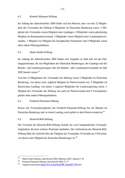 - 14 - 6.2. Konrad-Adenauer-Stiftung Im Anhang des Jahresberichtes 2004 findet sich der Hinweis, dass von den 22 Mitglie- dern des Vorstandes der Stiftung 9 Mitglieder im Deutschen Bundestag waren. 2 Mit- glieder des Vorstandes waren Mitglied eines Landtages, 4 Mitglieder waren gleichzeitig Mitglied im Bundesparteivorstand, 3 Mitglieder waren Mitglied eines Landesparteivor- standes, 1 Mitglied war Mitglied des Europäischen Parlaments und 9 Mitglieder waren ohne andere Führungsfunktion. 6.3. Hanns-Seidel-Stiftung Im Anhang des Jahresberichtes 2004 finden sich Angaben zu Zahl und Art der Füh- rungspositionen, die mit Mitgliedern des Deutschen Bundestages, der Landtage und der Bundes- und Landesregierungen oder der Bundes- oder Landesparteivorstände im Jahr 33 2003 besetzt waren. Von den 14 Mitgliedern des Vorstandes der Stiftung waren 2 Mitglieder im Deutschen Bundestag, von denen einer zugleich Mitglied im Parteivorstand war, 5 Mitglieder im Bayerischen Landtag, von denen 3 zugleich Mitglieder der Landesregierung waren. 1 Mitglied des Vorstandes der Stiftung war auch im Parteivorstand und 6 Vorstandsmit- glieder ohne andere Führungsfunktion. 6.4. Friedrich-Naumann-Stiftung Keines der Vorstandsmitglieder der Friedrich-Naumann-Stiftung hat ein Mandat im 34 Deutschen Bundestag oder in einem Landtag, noch gehört es dem Parteivorstand an. 6.5. Heinrich-Böll-Stiftung Der Vorstand der Heinrich-Böll-Stiftung besteht aus zwei hauptamtlichen Vorstands- mitgliedern, die kein weiteres Parteiamt innehaben. Der Aufsichtsrat der Heinrich-Böll- Stiftung führt die Aufsicht über die Tätigkeit des Vorstandes. Er besteht aus 9 Personen, 35 von denen einer Mitglied des Deutschen Bundestages ist. 33 Hanns Seidel Stiftung, Jahresbericht 2004, München 2005, Anhang S. 59. 34 Friedrich-Naumann Stiftung, Jahresbericht 2004, S. 77. 35 Angaben entnommen http://www.boell.de/08_found/1159.html