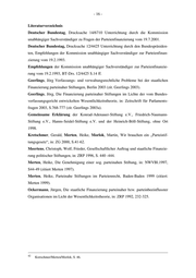 - 16 - Literaturverzeichnis Deutscher Bundestag, Drucksache 14/6710 Unterrichtung durch die Kommission unabhängiger Sachverständiger zu Fragen der Parteienfinanzierung vom 19.7.2001. Deutscher Bundestag, Drucksache 12/4425 Unterrichtung durch den Bundespräsiden- ten, Empfehlungen der Kommission unabhängiger Sachverständiger zur Parteienfinan- zierung vom 19.2.1993. Empfehlungen der Kommission unabhängiger Sachverständiger zur Parteienfinanzie- rung vom 19.2.1993, BT-Drs. 12/4425 S.14 ff. Geerlings, Jörg Verfassungs- und verwaltungsrechtliche Probleme bei der staatlichen Finanzierung parteinaher Stiftungen, Berlin 2003 (zit. Geerlings 2003). Geerlings, Jörg, Die Finanzierung parteinaher Stiftungen im Lichte der vom Bundes- verfassungsgericht entwickelten Wesentlichkeitstheorie, in: Zeitschrift für Parlaments- fragen 2003, S.768-777 (zit. Geerlings 2003a). Gemeinsame Erklärung der Konrad-Adenauer-Stiftung e.V., Friedrich-Naumann- Stiftung e.V., Hanns-Seidel-Stiftung e.V. und der Heinrich-Böll-Stiftung, ohne Ort 1998. Kretschmer, Gerald, Merten, Heike, Morlok, Martin, Wir brauchen ein „Parteistif- tungsgesetz“, in: ZG 2000, S.41-62. Meertens, Christoph, Wolf, Frieder, Gesellschaftlicher Auftrag und staatliche Finanzie- rung politischer Stiftungen, in: ZRP 1996, S. 440 -444. Merten, Heike, Die Genehmigung einer sog. parteinahen Stiftung, in: NWVBl.1997, S44-49 (zitiert Merten 1997). Merten, Heike, Parteinahe Stiftungen im Parteienrecht, Baden-Baden 1999 (zitiert: Merten 1999). Ockermann, Jürgen, Die staatliche Finanzierung parteinaher bzw. parteinbeeinflusster Organisationen im Licht der Wesentlichkeitstheorie, in: ZRP 1992, 232-325. 42 Kretschmer/Merten/Morlok, S. 46.