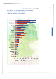 Rechtsextremistische Bestrebungen Gewalttaten mit erwiesenem oder zu vermutendem fremdenfeindlichem Hintergrund Tötungsdelikte Versuchte Tötungsdelikte Körperverletzungen Brandstiftungen Herbeiführen einer Sprengstoffexplosion Landfriedensbruch Fremdenfeindliche Gewalttaten insgesamt 1996 1997 0 0 11 8 307 406 27 25 0 27 22 372 462 2.3 Verteilung der Gewalttaten auf die Länder Die meisten Gewalttaten mit erwiesenem oder zu vermutendem rechtsextremistischem Hintergrund ereigneten sich in Nordrhein- Westfalen {11 9; 1996: 100) und Brandenburg (98 ; 1996: 72). Be- zogen auf die Einwohnerzahlen ist ein deutlicher Schwerpunkt in den neuen Ländern festzustellen . Im Durchschnitt wurden dort 2,7 Ge- walttaten je 100.000 Einwohner registriert, in den alten Ländern 0, 7. 77
