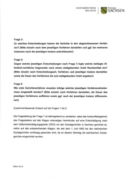 STAATSMINISTERIUM DER JUSTIZ # Freistaat SACHSEN Frage 3: Zu welchen Entscheidungen kamen die Gerichte in den abgeschlossenen Verfah- ren? (Bitte einzeln nach dem jeweiligen Verfahren darstellen und ggf. bei mehreren lnstanzen nach der jeweiligen lnstanz aufschlüsseln!) Frage 4: Gegen welche jeweiligen Entscheidungen nach Frage 3 legte welche beklagte öf- fentlich-rechtliche Gegenseite nach einem stattgebenden Urteil Rechtsmittel ein? (Bitte einzeln nach Entscheidungsart, Verfahren und jeweiliger lnstanz darstellen sowie die Dauer des Verfahrens bis zum stattgebenden Urteil angeben!) Frage 5: Wie viele Gerichtsverfahren mussten infolge welcher jeweiligen Verfahrenshinder- nisse eingestellt werden? (Bitte einzeln nach Verfahren darstellen, die Dauer des jeweiligen Verfahrens aufführen sowie ggf. nach der jeweiligen lnstanz differenzie- ren!) Zusammenfassende Antwort auf die Fragen 1 bis 5 Die Fragestellung der Frage 1 ist dahingehend zu verstehen, dass das Auskunftsbegehren des Fragestellers auf alle Klagen ehemaliger Heimkinder auf eine Entschädigung nach dem Opferentschädigungsgesetz (OEG) vor den Sozialgerichten in Sachsen gerichtet ist, mithin auf alle entsprechenden Klagen, die seit dem 1. Juni 1992 bei den sächsischen Sozialgerichten anhängig geworden sind, da an diesem Stichtag die sächsischen Sozial- gerichte eingerichtet wurden. Seite 2 von 5