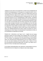 STAATSMINISTERIUM Freistaat DER JUSTIZ w SACHSEN schädigung nach dem OEG ist nicht eingerichtet. Es müssten bei den Sozialgerichten alle Verfahren der Sachgebietsgruppe 100 herausgesucht und ausgewertet werden. Das wür- de etwa 2.500 bis 3.000 Verfahren betreffen. Erst ab dem Jahrgang 2004 ist dazu eine automatisierte Recherche möglich. Bei den Verfahren, die vor dem Jahr 2004 und damit vor der Einführung der Geschäftsstellenautomation anhängig geworden sind, wäre keine automatische Recherche nach der Sachgebietsgruppe möglich gewesen. Anschließend wären diese Verfahren nach Klagen ehemaliger Heimkinder auf eine Entschädigung nach dem OEG händisch zu durchsuchen gewesen. Die aufzuwendende Gesamtzeit je Verfah- ren wurde dabei mit durchschnittlich etwa zehn Minuten eingeschätzt. Nach der ldentifizie- rung der Klagen ehemaliger Heimkindern auf eine Entschädigung nach dem OEG wären die Akten dieser identifizierten Verfahren sämtlich händisch durchzusehen und hinsichtlich der aufgeworfenen Fragen detailliert auszuwerten gewesen. Für alle diese Arbeiten wären nach Schätzungen der Sozialgerichte mehrere hundert Stunden Arbeit aufzuwenden ge- wesen. Eine vollständige Beantwortung der Kleinen Anfrage war deshalb auch unter Be- rücksichtigung des hohen Ranges des parlamentarischen Auskunftsrechts mit Blick auf die Arbeitsfähigkeit der Staatsregierung unzumutbar. Erläuternd wird - insbesondere zu den Fragen 3 und 4 - mitgeteilt, dass der Ausgang gerichtlicher Verfahren aus Sicht der Kläger oder der Beklagten allein in den Fällen sicher festgestellt werden kann, in denen das Gericht eine Entscheidung in der Sache getroffen hat. ln den Verfahren, die beispielsweise durch Rücknahme der Klage oder des Rechts- mittels, durch übereinstimmende Erledigungserklärung oder durch Vergleich erledigt wur- den, kann eine solche Feststellung nicht sicher getroffen werden. Verfahren, die nicht durch eine gerichtliche Entscheidung erledigt wurden, sind daher in der Tabelle in der An- lage durch ein Kreuz in der Spalte,,keine" kenntlich gemacht. ln den erfassten Rechtsmittelverfahren beim Sächsischen Landessozialgericht wurde das Rechtsmittel stets durch die Klägerinnen und Kläger der ersten lnstanz eingelegt. Seite 4 von 5