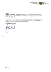 _?” [ SACHSEN STAATSMINISTERIUM Freistaat DES INNERN Frage 3: Wird es nach dem 15. Ausbildungsdurchgang zur sächsischen Wachpolizei, be- ginnend am 7. August 2019, weitere Ausbildungsdurchgänge zur sächsischen Wachpolizei geben? Entsprechend § 12 des Sächsischen Wachpolizeidienstgesetzes tritt dieses Gesetz mit Ablauf des 31. Dezember 2020 außer Kraft. Daher ist nach dem 15. Ausbildungsdurch- gang kein weiterer Ausbildungsdurchgang vorgesehen. Mit ndlichen Grüßen „{ [i P f. Dr. Roland Wöller Anlage Seite 2 von 2