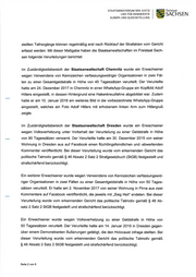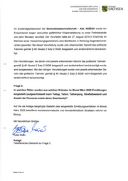 STAATSMINISTERIUM DER JUSTIZ UND FÜR DEMOKRATIE EUROPA UND GLE]CHSTELLUNG 5 Freistaat SACHSEN lm Zuständigkeitsbereich der Generalstaatsanwaltschaft - Abt. IIUZESA wurde ein Erwachsener wegen versuchter gefährlicher Körperverletzung zu einer Freiheitsstrafe von zehn Monaten verurteilt. Der Verurteilte hatte am27. August 2018 in Chemnitz im Rahmen eines Versammlungsgeschehens eine Bierflasche in Richtung Gegendemonst- ranten geworfen. Bei dieser Verurteilung wurde vom erkennenden Gericht das politische Tatmotiv gemäß $ 46 Absatz2 Satz 2 StGB festgestellt und strafschärfend berücksich- tigt. Die Verurteilungen, bei denen vom jeweils erkennenden Gericht das politische Tatmotiv gemäß $ 46 Absatz2 Satz 2 StGB festgestellt und strafschärfend berücksichtigt wurde, sind ausgewiesen. Bei den übrigen Verurteilungen wurde vom jeweils erkennenden Ge- richt das politische Tatmotiv gemäß $ 46 Absatz 2 Satz 2 StGB nicht festgestellt und strafschärfend berücksichtigt. Frage 3: In welchen Fällen wurden aus welchen Gründen im Monat März 2020 Ermittlungen eingestellt (aufgeschlüsselt nach Tattag, Tatort, Tathergang, Straftatbestand und Anzahl der Personen sowie deren Geschlecht)? Auf die als Anlage beigefügte Statistik über eingestellte Ermittlungsverfahren im Monat März 2020 betreffend rechtsextremistische und fremdenfeindliche Straftaten nehme ich Bezug. Mit freundlichen Grü a Anlage Tabellarische Übersicht zu Frage 3 Seite 6 von 6