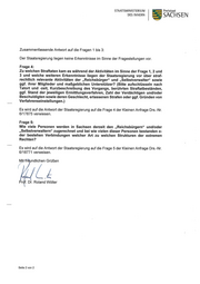 STAATSMINISTERIUM Freistaat DES INNERN SACHSEN Zusammenfassende Antwort auf die Fragen 1 bis 3: Der Staatsregierung liegen keine Erkenntnisse im Sinne der Fragestellungen vor. Frage 4: Zu welchen Straftaten kam es während der Aktivitäten im Sinne der Frage 1, 2 und 3 und welche weiteren Erkenntnisse liegen der Staatsregierung vor über straf- rechtlich relevante Aktivitäten der „Reichsbürger“ und „Selbstverwalter“ sowie ggf. ihrer Mitglieder und maßgeblichen Unterstützer? (Bitte aufschlüsseln nach Tatort und -zeit‚ Kurzbeschreibung des Vorgangs, berührten Straftatbeständen, ggf. Stand der jeweiligen Ermittlungsverfahren, Zahl der Verdächtigen undloder Beschuldigten sowie deren Geschlecht, erlassenen Strafen oder ggf. Gründen von Verfahrenseinstellungen.) Es wird auf die Antwort der Staatsregierung auf die Frage 4 der Kleinen Anfrage Drs.-Nr. 6/17875 verwiesen. Frage 5: Wie viele Personen werden in Sachsen derzeit den „Reichsbürgern“ undloder „Selbstvenfvaltern“ zugerechnet und bei wie vielen dieser Personen bestanden o- der bestehen Verbindungen welcher Art zu welchen Strukturen der extremen Rechten? Es wird auf die Antwort der Staatsregierung auf die Frage 5 der Kleinen Anfrage Drs.—Nr. 6118771 verweisen. Seite 2 von 2