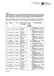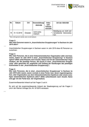STAATSMINISTERIUM Freistaat DES INNERN SACH SEN Frage 5: Kam es bei Aktivitäten im Sinne der Nummer 1. zu Straftaten? (Bitte aufschlüsseln nach jeweiliger Handlung, Straftatbestand, Ermittlungsverfahren und dessen Aus- gang) Es wird auf die Anlage verwiesen. Mit freundlichen Grüßen .D. RolandWöller Anlage Seite 5 von 5
