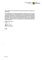 STAATSMINISTERIUM - Freistaat DES INNERN SACH SEN deckt, unterliegt der kommunalpolitischen Ermessensentscheidung des jeweiligen Auf- gabenträgers. Für die Bewältigung der Folgen des demografischen Wandels im Bereich der Abwas- serentsorgung gibt es keine Standardlösungen; jeder Zweckverband hat in Wahrneh- mung seiner Organisations- und Finanzhoheit eine mit der zuständigen Wasserbehörde abgestimmte, seinen örtlichen Verhältnissen angepasste Lösung zu finden. Soweit sich im Einzelfall abzeichnet, dass die demografische Entwicklung zu einer Problemlage führen kann, wird dies im Rahmen des in der Antwort auf die Frage 4 geschilderten Verfahrens zur Beobachtung der Haushaltssituation der Abwasserzweckverbände zu berücksichtigen sein. _ ?undlichen Grüßen Pr f. D . Roland Wöller Anlage Seite 5 von 5