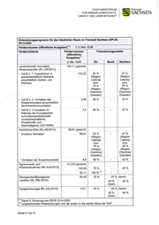 STAATSfuIINISTERIUM FÜR ENERGIE, KLIIVIASCHUTZ, U]VIWEUT UND LANDWIRTSCHAFT It Freistaat SACHSEN Entwicklungsprogramm für den ländlichen Raum im Freistaat Sachsen (EPLR) 2014-2020 Fördervolumen (öffentliche Ausgaben) 1): 1,13 Mrd. EUR Förderrichtlinie Fördervolumen Finanzierungsanteile (öffentliche t) Ausgaben) in Mio. EUR EU Bund I Sachsen Landwirtschaft , ln novation, 143,11(gesamt) Wissenstransfer ( RL LIW l2O1 4) - Teil B ll. 1. lnvestitionen in 133,22 53 o/o 47 o/o landwirtschaftl iche Betriebe (Region (Region einschließlich Garten- und Leipzig) Leipzig) Weinbau bzw. bzw. 75 o/o 25 o/o (Region (Region Chemnitz/ Chemnitz/ Dresden) Dresden) o/o Teil B ll. 2. Vorhaben des 2,89 80% 20 Wissenstransfers einschließl ich Demonstrationsvorhaben Teil B ll. 3 Vorhaben im 7,0 80% 20% Rahmen der Europäischen I n novationspa rtnerschaft >Landwirtschaftliche Produktivität und Nachhaltigkeit< (El P AGRI) Natürliches Erbe (RL NE/2014) 66,61 (gesamt) - lnvestive Vorhaben 58,01 53 o/o 47% (Region (Region Leipzig) Leipzig) bzw. bzw. 75 o/o 25% (Region (Region Chemnitz/ Chemnitz/ Dresden) Dresden) - Vorhaben der Zusammenarbeit 8,6 B0 o/o 20 o/o Agrarumwelt und 212,63 (gesamt) Klimamaßnahmen (RL Aul(20 1 5) 150,52 75% 62,11 1OO o/o2l o/o, davon'. Ökologischer/Biolog ischer 84,49 75% 25 Landbau (RL OBL/2015) 60% I qou (cAK) I 25 o/o, Ausgleichszulage (RL AZL|201 5) 1 10,1 75 Yo davon: 60% I +0"t" (cAK) I t)Stand 5. Anderung des EPLR 2014-2020 2) umgeschichtete Direktzahlungen von der ersten in die zweite Säule der GAP Seite 2 von 4
