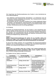 STAATSNIiNiSTERiUM Freista at DES iNNERN SACHSEN Den Angehörigen des Streifeneinzeldienstes ohne Funktion in einer Aufrufeinheit ste- hen als Mannausstattung —eine ballistische Unterziehschutzweste (Schutzklasse 1) mit Stichschutz nach der Technischen Richtlinie „Ballistische Schutzwesten“ des Poiizeitechnischen Institutes der Deutschen Hochschule der Polizei, - ein Schutzhelm nach der Technischen Richtlinie für ein modular aufgebautes System „Schutzhelm, Hör—/Sprechgarnitur‚ Atemschutzmaske“ des Poiizeitechnischen Institu- tes der Deutschen Hochschule der Polizei (Prüfung auf Chemikalienverhalten, Brenn- verhalten, Stoßdämpfung sowie Durchdringungsfestigkeit) zur Verfügung. Angehörige des Streifeneinzeldienstes, die eine Funktion in einer Aufrufeinheit wahr— nehmen, verfügen darüber hinaus über eine leichte Körperschutzausstattung (Oberkör- per-‚ Schulter-‚ Arm- und Beinschutz) nach der Technischen Richtlinie „Körperschutz- ausstattungen" des Polizeitechnischen Institutes der Deutschen Hochschule der Polizei (Prüfung auf Schlaghemmung, Stichhemmung). Frage 3: Welche Körperschutzausstattungen für welche Art von Angriffen stehen den Kräften aus Fragen 1 und 2 tatsächlich jederzeit zur Verfügung, die keine Mann- ausstattung sind? (Bitte Angaben nach Revier/Polizeistandort und Stückzahl) Es wird auf die Anlage verwiesen. Es ist ausschließlich die Körperschutzausstattung aufgeführt, die als Ausrüstungspool zur Verfügung steht. Dienststellen/Organisations- einheiten ohne entsprechenden Bestand sind nicht aufgeführt. Frage 4: Welche Arten von Angriffen sollen die in Fragen 1 bis 3 einzeln genannten Aus- rüstungsgegenstände jeweils standhalten? (Bitte einzeln angeben Beschuss, Stich, Schnitt, Schlag und jeweilige Schutzklasse) Die Angaben sind der Tabelle zu entnehmen: Ausrüstung Art des Angriffes Schutzklasse Ballistische Unterzieh- Beschuss, Schnitt, Stich Schutzklasse 1 schutzweste inkl. Stich- schutz Schutzhelm Schlag, Schnitt, Stich Technische Richtlinie für ein modular aufgebautes System „Schutzhelm, Hör-lSprech- garnitur, Atemschutzmaske" Leichte Körperschutz— Schlag, Stich, Schnitt Technische Richtlinie „Kör— ausstattung perschutzausstattungen" Schutzschild Schlag, Schnitt Technische Richtlinie „Schutzschild — lang, durch- sichtig“ Ballistische Überzieh- Beschuss, Schnitt, Stich Schutzklasse 2 schutzweste Seite 2 von 3