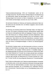 STAATSMINISTERIUM DER JUSTIZ s Freistaat SACHSEN Telekommunikationsübennrachungs- (TKÜ) und Funkzellendaten werden auf der Grundlage der $$ 100a, 1009 StPO erhoben. Rechtsgrundlage für die Datengewinnung aus elektronischen Geräten des Beschuldigten sind die SS 102, 110 Abs. 1 StPO. Rechtsgrundlage für die Durchsicht von Daten in Clouddiensten, die mit den elektroni- schen Geräten des Beschuldigten verbunden sind, ist S 1 10 Abs. 3 SIPO. Die technischen Standards der Sicherung und Auswertung elektronischer Daten wer- den jeweils durch die venvendete Hard- und Software vorgegeben, wobei eine Zertifi- zierung nicht vorliegt. Die Sicherung und Auswertung elektronischer Datenträger erfolgt in der Regel durch die Polizei. Dort erfolgt die Verarbeitung erhobener, beweiserheblicher digitaler Daten auf Antrag der ermittlungsführenden Stelle nach festgelegten Prinzipien und Arbeitsrou- tinen unter Nutzung der zur Verfügung stehenden technischen Möglichkeiten. Dabei werden forensische Untersuchungen grundsätzlich nicht an der Originaldatei (Urkopie) vorgenommen. Diese bleibt bis zum Ende des Strafuerfahrens unverändert. Ausnah- men bilden allein Maßnahmen zum Schutz des Kernbereichs privater Lebensgestaltung sowie zum Schutz von Berufsgeheimnisträgern im Rahmen von Übenvachungsmaß- nahmen. Die technischen Vorgänge werden in der Akte dokumentiert und können von allen Be- teiligten des Strafuerfahrens nachvollzogen werden. Die elektronischen Daten werden als Beweismittel zu dem jeweiligen Verfahren asserviert. ln Einzelfällen erfolgen bei den Staatsanwaltschaften die Sicherung und die Auswertung der elektronischen Daten durch die/den Referent/in für lT-Forensik. Die von diesem genutzte Hard- und Software wurde unter Beachtung der Vorgaben des Bundesamtes für Sicherheit in der lnformati- onstechnik (BSl) beschaft. Die ReferenUinnen für lT-Forensik venrenden den ,,Leitfa- den lT-Forensik" des BSl, der die grundlegenden Standards der lT-Forensik beschreibt. Soweit Telekommunikationsdaten durch Telekommunikationsdienstleister sichergestellt und übermittelt werden, sind die dafür erforderlichen technischen Einrichtungen gemäß S 110 TKG durch die Telefondienstleister vorzuhalten. Danach legt die Bundesnetza- gentur technische Einzelheiten, die zur Sicherstellung einer vollständigen Erfassung der zu übenruachenden Telekommunikation und zur Auskunftserteilung sowie zur Ge- Seite 3 von 9