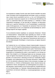 STAATSMINISTERIUIVI DER JUSTIZ 5 Freistaat SACHSEN Die Komplexität der digitalen Forensik sowie deren Dynamik hinsichtlich des perma- nenten Hinzutretens neuer Ermittlungsmethoden/-technologien machen es erforderlich, dass in diesem Bereich ausschließlich durch die o. g. Aus- und Fortbildungsmaßnah- men geschultes Fachpersonal eingesetzt wird. Zur Sicherung der Beweisführung wird zudem im zunehmenden Maße auch externe Expertise (u. a. Gutachter) im Ermitt- lungsverfahren hinzugezogen. Um das hohe Maß an Transpatenz und Nachvollzieh- barkeit auch im gesamten Strafuerfahren für alle Prozessbeteiligten zu gewährleisten, werden Ermittlungspersonen und lT-Spezialisten der sächsischen Polizei immer häufi- ger in Verhandlungen bei Amts- und Landgerichten als Sachverständige bzw. sachver- ständige Zeuginnen oder Zeugen vorgeladen. Für die erforderliche fachliche Qualifikation von sächsischen Richterinnen / Richtern und Staatsanwältinnen / Staatsanwälten finden regelmäßig eine Vielzahl von Fortbil- dungsveranstaltungen an der Deutschen Richterakademie (DRA) und landeseigene Fortbildungsveranstaltungen zu den vorgenannten Themenbereichen statt, die sich u.a. auch mit strafprozessualen Rechtsfragen im Zusammenhang mit digitalen Beweismit- teln befassen. Das Fundament der Aus- und Fortbildung im Bereich Cyberkriminalität in Sachsen bil- det eine im Jahr 2018 eingeführte flächendeckende Grundqualifizierung der Staatsan- wältinnen / Staatsanwälte, die konzeptionell auf einen großen Teilnehmerkreis und eine praxisbezogene Wissensvermittlung in kurzer Zeit vor Ort ausgerichtet ist. Die Fortbil- dungsinhalte der Grundqualifizierung wurden in sechs Module zu je vier Stunden ge- gliedert. Dies ermöglicht es, die Fortbildungen flexibel nach den individuellen Anforde- rungen der täglichen Dezernatsarbeit wahrzunehmen und regelmäßig noch das Tages- geschäft vor Ort wahrzunehmen. Gleichzeitig wird damit auch Teilzeitkräften Gelegen- heit gegeben, ohne Zusatzaufwand an den Schulungen teilzunehmen. lnhaltlich befas- sen sich die aufeinander aufbauenden Module mit den technischen Grundlagen und Funktionsweise (u.a. Hardware und Betriebssysteme, lnternet, Überblick Darknet, Zah- lungsdienste im lnternet, internetgestützte und mobilfunkgestützte Kommunikation, so- ziale Netzwerke), Cyberkriminalität und ihre Erscheinungsformen, Eingriffsmaßnahmen und ihre Rechtsgrundlagen (u.a. Datenarten, Übenvachungsmaßnahmen) und Ermitt- lungsmethoden und technische Hilfsmittel (u.a. Auswertungsmöglichkeiten von Daten- trägern). Seite 7 von 9
