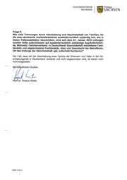 STAATSMINISTERIUM Freistaat DES INNERN SACH SEN Frage 5: Wie viele Trennungen durch Abschiebung und Abschiebehaft von Familien, für die eine sächsische Ausländerbehörde ausländerrechtlich zuständig war, wie in dieser Fallkonstellation beschrieben, sind seit dem 01. Januar 2015 vollzogen worden (bitte aufschlüsseln auf ausländerrechtlich zuständige Ausländerbehör- de, Wohnsitz, Familienverband, in Deutschlandl Abschiebehaft verbliebene Fami- lienteile und abgeschobene Familienteile, Alter und Geschlecht der Betroffenen, Ort des Vollzugs der Abschiebehaft, ggf. außerhalb Sachsens)? Der Fall, dass bei der Abschiebung einer Familie der Ehemann und Vater in der Ab- schiebungshaft in Deutschland verbleibt und nicht abgeschoben wird, ist bisher noch nicht eingetreten. Mitfr'e ndlichen Grüßen '(„jlza P of Dr. Roland Wöller Seite 3 von 3