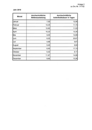 Anlage 2 zu Drs.-Nr. 7/1702 Jahr 2019 Monat durchschnittliche durchschnittliche Bettenauslastung Aufenthaltsdauer in Tagen Januar 7,00 12,06 Februar 14,25 11,74 März 12,62 11,53 April 10,23 13,35 Mai 9,00 14,68 Juni 6,20 20,67 Juli 4,68 9,67 August 5,45 9,94 September 6,50 17,73 Oktober 5,32 9,17 November 11,97 14,96 Dezember 9,84 13,26