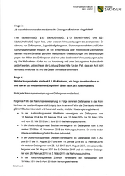 STAATSMINISTERIUM DER JUSTIZ 5 Freistaat SACHSEN Frage 1: Wie stellt sich der Sachverhalt aus Sicht der Staatsregierung dar? Zum Zeilpunkt der Berichterstattung der Leipziger Volkszeitung am 20. Januar 2020 befand sich in der Justizvollzugsanstalt Leipzig mit Krankenhaus kein Gefangener, der die Nahrungsaufnahme venrveigerte. Frage 2: Gibt es eine Verwaltungsvorschrift o.A. wie mit der Protestform umgegangen wird (Medizinische Begleitung, Soziale Arbeit, etc.)? (Bitte nach JVA aufschlüs- seln) Folgende Vorschriften enthalten Regelungen zu Zwangsmaßnahmen auf dem Gebiet der Gesundheitsfürsorge im Sächsischen Justizvollzug: - S 68 Sächsisches Stratuollzugsgesetz (SächsStVollzG), - S 33 Sächsisches Jugendstratuollzugsgesetz (SächsJStVollzG), - S 73 Sächsisches Sicherungsvenruahrungsvollzugsgesetz (SächsSWollzG) und - S 21 Sächsisches Untersuchungshaftvollzugsgesetz (SächsUHaftVollzG). Verordnungen oder Venrualtungsvorschriften zum Thema Nahrungsvenveigerung bzw. zwangsweiser Ernährung wurden vom Sächsischen Staatsministerium der Justiz und für Demokratie, Europa und Gleichstellung nicht erlassen. Das Sächsische Staatsministerium der Justiz und für Demokratie, Europa und Gleich- stellung hat den Justizvollzugsanstalten Hinweise zur Auslegung der genannten ge- setzlichen Vorschriften erteilt. Für Nahrungsvenreigerungen von Gefangenen gibt es unterschiedliche Motive. Wird eine Nahrungsvenveigerung bekannt, werden einzelfallbezogen geeignete Maßnahmen veranlasst. Dazu gehören insbesondere die Motivationserforschung, die Aufklärung des Gefangenen über mögliche Konsequenzen, die Motivierung zur Nahrungsaufnahme, die ärztliche Übenruachung, die psychologische Betreuung, die Beobachtung und Do- kumentation. Vor allem werden Gesprächsangebote von Fachdiensten des Justizvoll- zuges (Arzte, Psychologen, Sozialdienste), ggf. Seelsorgern oder Verteidigern unter- breitet bzw. vermittelt; ein Dolmetscher wird bei Bedarf gestellt. Seite 2 von 5