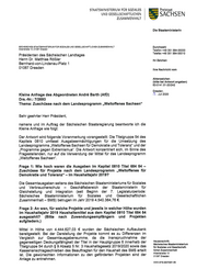 STAATSMIN1STERIUM FÜR SOZ1ALES Freistaat UND GESELLSCHAFTUCHEN SACHSEN ZUSAMMENHALT Die Staats m inis ter in SACHSISCHES STAATSMINISTERIUM FÜR SOZIALES UND GESELLSCHAFTLICHEN ZUSAMMENHALT Durchwahl Albertstraße 10101097 Dresden Telefon +49 351 564-55000 Telefax +49 351 564-55010 Pr äs i dent en des Säc hs i s c hen Landt ages Her r n Dr . Mat t hi as Rößl er Ihr Zeichen Ber nhar d- von- Li ndenau- Pl at z 1 0 1 0 6 7 D r es d en lhre Nachricht vom Aktenzeichen (bitte bei Antwort angeben) 63-0141.51-20/242 Dresden, K l ei n e A n f r ag e d es A b g eo r d n et en A n d r é B ar t h ( A f D) . Juli 2020 Dr s . -Nr . : 7/ 2693 T h e m a : Z u s c h ü s s e n a c h d e m L a n d e s p r o g r a m m „ We l t o f f e n e s S a c h s e n " Sehr geehr t er Her r Pr äsi dent , n a m en s u n d i m A u f t r a g d er S ä c h s i s c h en S t a a t s r eg i er u n g b ea n t w o r t e i c h d i e Kl ei ne Anf rage wi e f ol gt : Der Ant wor t wi r d f ol gende Vor anm er kung vor angest el l t : Di e Ti t el gr uppe 54 des Kapitels 0810 umfasst Ausgabeermächtigungen für die Umsetzung des Landesprogram m s „W el t of f enes Sachsen f ür Dem okrat i e und Tol eranz" und der „ Pr ogr am m e gegen Ext r em i sm us". Di e Ant wor t konzent r i er t si ch, i m Si nne des F r a g es t el l en d en , n u r a u f d i e Ver wen d u n g d er Mi t t el f ü r d a s L a n d es p r o g r a m m „ W el t of f enes Sachsen". Frage 1: Wi e hoch waren di e Ausgaben i m Kapi tel 0810 Ti tel 684 54 — Zuschüsse für Projekte nach dem Landesprogram m „Weltoffenes für Dem okrat i e und Tol eranz" — i m Haushal t sj ahr 2019? Di e G esam t ausgaben sei t ens des Sächsi schen St aat sm i ni st er i um s f ür Sozi al es und Verbraucherschutz — Geschäftsbereich der Staatsministerin für Gleichstellung und Integration (seit Beginn der 7. Legislaturperiode: Sächsisches Staatsministerium für Soziales und Gesellschaftlichen Zusammenhalt — SMS) betrugen im Jahr 2019 4.540.384,76 €. Frage 2: An wen, für welche Projekte und jewells in welcher Höhe wurden im Haushaltsjahr 2019 Haushaltsmittel aus dem Kapitel 0810 Titel 684 54 ausgezahlt? (Bitte nach Zuwendungsempfängern und Projekten aufgliedern.) Mittel in Höhe von 4.444.627,03 € wurden der Sächsischen Aufbaubank bereitgestellt. Bei der Darstellung der Projekte kommt es zu Differenzen im Vergleich zur Gesamtausgabensumme, da die lnanspruchnahme der Hausanschrlft: gegenseitigen Deckungsfähigkeit der Titel in der Hauptgruppe 6 innerhalb der Sächsisches Staatsminlsterlum Titelgruppe 54 durch § 9 Absatz 5 Nr. 3 Haushaltsgesetz 2019/2020 sowie das für Sozlales und Gesellschaft- Kassenanschlagsschreiben des Beauftragten für den Haushalt des SMS erteilt lichen Zusammenhalt Albertstraße 10 ist. Die gewünschten Informationen zu den geförderten Projekten sind der 01097 Dresden Anlage zu entnehmen. www.sms.sachsen.de