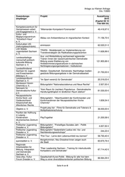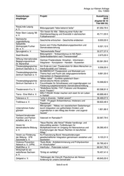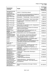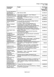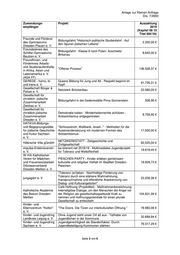 Anlage zur Kleinen Anfrage Drs. 7/2693 Zuwendungs- Projekt Auszahlung empfänger 2019 (Kapitel 08 10 Titel 684 54) Courage-Werkstatt für demokratische Open Saxony! (OSX) 31.564,07 € Bildungsarbeit e. V. Deutsche Kinder- und "Demokratie in Kinderhand - frühe Teilhabe im 128.277,94 € Jugendstiftung gGmbH Gemeinwesen stärken" Mikroprojekt - "Fluchtpunkte! Flucht aus, in und nach Die Multivision e. V. 3.498,00 € Deutschland" different people e. V. "Akzeptanz leben? Lass uns reden!" 80.983,80 € Entwicklungspolitisches Für ein gerechtes und menschenwürdiges Sachsen! Netzwerk Sachsen 85.258,26 € Ein Bündnis gegen Rassismus. e. V. "Im Dialog... gegen Fremdenfeindlichkeit und Ephraim Carlebach Antisemitismus in unserer Mitte". Ein Leipziger 40.158,00 € Stiftung Initiativprojekt zum kreativen Umgang mit Geschichte Equilibre International "Gemeinsam in Vielfalt - Workshopmodule und 55.469,61 € e. V. Migrationskonferenzen für Jugendliche in Sachsen" "Erich-Zeigner-Haus. Bildungs- und Begegnungsstätte Erich-Zeigner-Haus gelebter Zivilcourage. 43.928,32 € e. V. Beteiligungsprojekt: Jugend erforscht Geschichte - macht Geschichte erlebbar." Evangelische Musiktheaterprojekt "Spiel des Grauens" (schulisches Schulgemeinschaft 12.870,00 € Bildungsprojekt) Erzgebirge e. V. Ev.-Luth. Kirchenbezirk Ausfahrt zum Abbau von Antisemitismus und 1.036,40 € Annaberg Aufklärung Ev.-Luth. Landeskirche "Nächstenliebe leben. Klarheit zeigen" - ein Projekt der Sachsens ökumenischen Arbeitsgemeinschaft "Kirche für 67.644,00 € Landeskirchenamt Demokratie und Menschenrechte" Förderverein der Bildungsfahrt - "Deutsch-deutsche Schulbegegnung im Mittelschule Kitzscher Grenzlandmuseum Teistungen 2019 - wo war die 750,00 € e. V. Mauer?" Bildungsfahrt - Besuch der Mahn- und Gedenkstätte Förderverein der Auschwitz-Birkenau, Besuch Schindlers Fabrik, Richard-von-Schlieben- Stadtführung u. a. durch das jüdische Viertel Krakaus 7.700,00 € Oberschule e. V. sowie Besuch der sich dort befindlichen großen Synagoge mit den Lehrkräften Förderverein des Christian - Gottfried - Bildungsfahrt - "Sehen - Entscheiden - Handeln" - 4.050,00 € Ehrenberg - Geschichtsexkursion Krakau Gymnasium e. V. Förderverein Integrierte Nutzung digitaler Potentiale für eine Tolerantes Sachsen lebendige demokratische Kultur und Zivilgesellschaft in 64.806,38 € e. V. Sachsen Förderverein zum Aufbau des Zeitzeugenbefragung (Oral History) zur Entstehung und Dokumentations- Entwicklung demokratisch. Einstellungsmuster nach 45.252,39 € zentrums Industrie- 1990 im Südraum Leipzig, Fortsetzung aus Maßnahme Kulturlandschaft 2017 (Teil 1) Mitteldeutschland e. V. FRAUENKULTUR e. V. "Treasure City. We are responsible." 18.630,00 € Freunde und Förderer Bildungsfahrt "Erinnerung und Verantwortung - Umgang des Gymnasiums 1.000,00 € mit der NS-Vergangenheit" Dresden-Plauen e. V. Seite 2 von 6