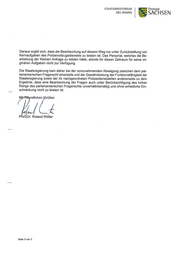 STAATSMlNlSTERIUM Freistaat DES INNERN SACH SEN Daraus ergibt sich, dass die Beantwortung auf diesem Weg nur unter Zurückstellung von Kernaufgaben des Polizeivollzugsdienstes zu leisten ist. Das Personal, welches die Be- arbeitung der Kleinen Anfrage zu leisten hätte, stünde für diesen Zeitraum für seine ori— ginären Aufgaben nicht zur Verfügung. Die Staatsregierung kam daher bei der vorzunehmenden Abwägung zwischen dem par- lamentarischen Fragerecht einerseits und der Gewährleistung der Funktionsfähigkeit der Staatsregierung sowie der ihr nachgeordneten Polizeidienststellen andererseits zu dem Ergebnis, dass eine Beantwortung der Fragen auch unter Berücksichtigung des hohen Rangs des parlamentarischen Fragerechts unverhältnismäßig und ohne erhebliche Ein- schränkung nicht zu leisten ist. ' ndlichen rüßen „f ‚75 P of. Dr. Roland Wöller Seite 3 von 3