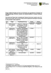 STAATSM1N1STER1UM FÜR SOZ1ALES Freistaat UND GESELLSCHAFTUCHEN SACHSEN ZUSAMMENHALT Fr ag e 3: Welc he Pr o j ek t e, d ie sic h um d ie K ind er und J ug end lic hen in Fam ilien m it Suc ht b elast ung en k ü m m er n, w er d en vo m So zialm inist er ium in w elc her Hö he g e- f ö r d er t ? Die Antwort auf Frage 3 k ann nachstehender Übersicht entnom m en werden (unter „För- d e r s um m e 2 0 1 9 b zw. 2 0 2 0 " s ind d ie m it t e ls Z uwe nd ung s b e s c he id b e willig t e n Z us c hü s s e f ü r d a s j e we ilig e P r o j e k t a uf g e f ü hr t ) : Lfd. Tr äg er Pr o j ek t b ezeic hnung Fö r d er - Fö r d er - Nr . sum m e 2019 sum m e 2020 1 AW O Kreisver- „ F a lls c hir m " - K ind e r a us 16.791 € 13.520 € band Bautzen s uc ht b e la s t e t e n F a m ilie n e. V. (Kooperation von Sucht- und Jugendhilfe) 2 Stadtm ission P IC K N IC K — S o zia lp ä d a g o - 17.759 € 1 _ Chemnitz e. V. gische Gruppenarbeit mit Kindern und Jugendlichen aus suchtbelasteten Fami- lien und Elternkompetenz- training - ein familienorien- tiertes Angebot für sucht- kranke Familien 3 Stadtmission Plan B - Hilfen für suchtge- 120.283 € 2 - Chemnitz e. V. fährdete und suchtkranke Menschen mit Elternverant- wortung und deren Kinder in Chemnitz 4 Stadtmission Familienorientierte Sucht- Chemnitz e. V. hilfe - 3 138.041 € (= Fortführung der Projekte unter Ifd. Nrn. 2 und 3 in modifizierter Form seit 01.07.2019) 5 AWO Kreisver- Kinder aus suchtbelasteten 5.426 € 5.426 € band Weißeritz- Familien stärken - Trampo- kreis e. V. lin 6 AWO Kreisver- Kind Sucht Eltern 23.300 € 23.300 € band Weißeritz- kreis e. V. 1 Förderzeitraum 01.01.- 30.06.2019 2 einschließlich Fördermittel für das ab 01.07.19 zusammengeführte Projekt unter Ifd. Nr. 4 3 für den Zeitraum 01.07.- 31.12.19 sind die Fördermittel inbegriffen in der Fördersumme unter Ifd. Nr. 3 Seite 2 von 4