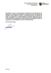 STAATSM1N1STER1UM FÜR SOZ1ALES Freistaat UND GESELLSCHAFTUCHEN SACHSEN ZUSAMMENHALT Des W eiteren wurden vom Freistaat Sachsen der Sächsischen Landesärztek am m er die Aufgabe einer Landesk oordinierungsstelle für m edizinischen Kinder- und Jugendschutz übertragen. Deren Aufgabe ist es, Sach- und Rechtsk enntnisse aus dem Bereich der Kinder- und Jugendhilfe für die Verfahrensabläufe in regionalen m edizinischen Einrich- t ung e n a uf z ua r b e i t e n und z u v e r m i t t e l n. D a d ur c h k ö nne n d i e d o r t t ä t i g e n F a c hk r ä f t e b e i einer verm uteten oder festgestellten Kindeswohlgefährdung die betroffenen Kinder und J ug e nd l i c he n i n d a s H i l f e s ys t e m d e r K i nd e r - und J ug e nd hi l f e l e i t e n. Mit freundlichen Grüßen Seite 4 von 4