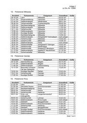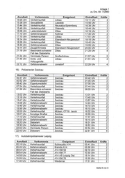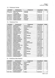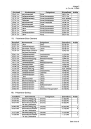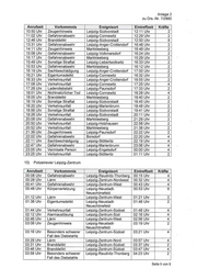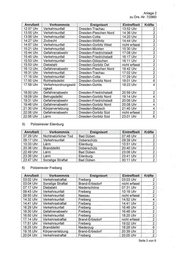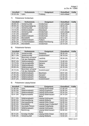 Anlage 2 zu Drs.—Nr. 7/2860 1) Polizeirevier Auerbach-Klingenthal Anrufzeit Vorkommnis Ereignisort Eintreffzeit Kräfte 00:29 Uhr Lärm Steinberg 00:53 Uhr 2 00:34 Uhr Verkehrsunfall Neumark 00:55 Uhr 2 07:08 Uhr Verkehrsunfall Reichenbach im Vogtland/ 07:35 Uhr 2 OT Rotschau 07:30 Uhr Sachbeschädigung FalkensteinNogtl. 07:52 Uhr 2 10:16 Uhr Verkehrsunfall Klingenthal 10:29 Uhr 2 11:38 Uhr Gefahrenabwehr Reichenbach im Vogtland 11:50 Uhr 2 11:58 Uhr Verkehrsunfall Rodewisch 12:00 Uhr 2 13:45 Uhr Gefahrenabwehr Lengenfeld 14:14 Uhr 2 16:19 Uhr Besonders schwerer Ellefeld 16:28 Uhr 2 Fall des Diebstahls 16:30 Uhr Besonders schwerer Reichenbach im Vogtland 16:40 Uhr 2 Fall des Diebstahls 16:51 Uhr Gefahrenabwehr AuerbachNogtl. 17:05 Uhr 2 18:33 Uhr Gefahrenabwehr Rodewisch 18:36 Uhr 4 19:23 Uhr Verkehrsunfall Netschkau 19:50 Uhr 2 20:45 Uhr Sachbeschädigung Reichenbach im Vogtland 20:50 Uhr 2 21:13 Uhr Besonders schwerer Treuen 21:21 Uhr 2 Fall des Diebstahls 23:11 Uhr Sachbeschädigung Netzschkau 23:21 Uhr 2 2) Polizeirevier Borna Anrufzeit Vorkommnis Ereignisort Eintreffzeit Kräfte 01:02 Uhr Lärm Borna 01:47 Uhr 2 02:13 Uhr Verkehrsunfall Groitzsch 02:25 Uhr 2 04:35 Uhr Besonders schwerer Rötha 04:49 Uhr 4 Fall des Diebstahls 06:48 Uhr Gefahrenabwehr Rötha 07:15 Uhr 2 08:53 Uhr Natürlicher Tod Borna 08:54 Uhr 2 08:55 Uhr Verkehrsunfall Frohburg 09:16 Uhr 2 09:33 Uhr Diebstahl Rötha 09:55 Uhr 2 10:01 Uhr Zeugenhinweis Großpösna 10:40 Uhr 2 11:25 Uhr Zeugenhinweis Pegau 11:43 Uhr 2 12:52 Uhr Verkehrsunfall Pegau 13:41 Uhr 2 12:59 Uhr Ladendiebstahl Zwenkau 13:21 Uhr 2 13:07 Uhr Verkehrsunfall Kitzscher 13:46 Uhr 2 13:09 Uhr Verkehrsunfall Großpösna 13:26 Uhr 2 14:13 Uhr Verkehrsunfall Frohburg 14:31 Uhr 2 15:29 Uhr Gefahrenabwehr Rötha 15:50 Uhr 2 16:24 Uhr Gefahrenabwehr Borna 16:32 Uhr 2 18:37 Uhr Zeugenhinweis Borna 18:46 Uhr 2 18:57 Uhr Gefahrenabwehr Frohburg 19:21 Uhr 2 19:13 Uhr Sachbeschädigung Regis-Breitingen 20:29 Uhr 2 20:22 Uhr Gefahrenabwehr Rötha 20:58 Uhr 2 23:38 Uhr Gefahrenabwehr Zwenkau 23:41 Uhr 4 Seite 1 von 9