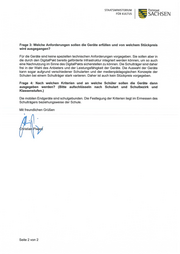 ~SACHsEN STAATSMlNlSTERlUM FÜR KULTUS Frage 3: Welche Anforderungen sollen die Geräte erfüllen und von welchem Stückpreis wird ausgegangen? Für die Geräte sind keine speziellen technischen Anforderungen vorgegeben. Sie sollen aber in die durch den DigitalPakt bereits geförderte Infrastruktur integriert werden können, um so auch eine Nachnutzung im Sinne des Digital Pakts sicherstellen zu können . Die Schulträger sind daher frei in der Wahl des Anbieters und der Leistungsfähigkeit der Geräte. Die Auswahl der Geräte kann sogar aufgrund verschiedener Schularten und der medienpädagogischen Konzepte der Schulen bei einem Schulträger stark variieren. Daher ist auch kein Stückpreis vorgegeben. Frage 4: Nach welchen Kriterien und an welche Schüler sollen die Geräte dann ausgegeben werden? (Bitte aufschlüsseln nach Schulart und Schulbezirk und Klassenstufen.) Die mobilen Endgeräte sind schulgebunden. Die Festlegung der Kriterien liegt im Ermessen des Schulträgers beziehungsweise der Schule. Mit freundlichen Grüßen p~ Seite 2 von 2