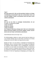STAATSMINISTERIUIVI DER JUSTIZ 5 Freistaat SACHSEN Frage 3: Wie lange dauerten 20'17,2018 und 2019 gerichtliche Verfahren am Amtsge- richt Marienberg durchschnittlich? (bitte nach Jahresscheiben trennen und nach Straf-, Bußgeld-, Familien- und Zivilsachen sowie nach Haupt- und Eil- verfahren aufsch lüsseln) Frage 4: Wie hoch war der Anteil an unerledigten Gerichtsverfahren, die zum 31.12.2017, 31.12.201 8 und 31.12.2019 a) länger als 6 Monate b) länger als 12 Monate c) länger als 24 Monate beim Amtsgericht Marienberg anhängig waren? (bitte nach Jahresscheiben getrennt die Summen angeben und nach Straf-, Bußgeld-, Familien- und Zivil- sachen sowie nach Haupt- und Eilverfahren aufschlüsseln) Zusammenfassende Antwort auf die Fragen 1 bis 4: Die Verfahrenseingänge, -bestände und -dauern sowie die Anzahl der Verfahren, die zu den jeweiligen Stichtagen länger als sechs Monate, zwölf Monate und 24 Monate anhängig waren, können der Tabelle in der Anlage entnommen werden. Bezüglich der Fragen 1 bis 3 sind Verfahren in Zuständigkeit der Rechtspflegerin/des Rechtspflegers, denen ein richterliches Verfahren nicht vorausging, nicht Gegenstand der vorliegenden amtlichen Statistiken in Straf- und Bußgeldsachen, Familiensachen und Zivilsachen und somit darüber nicht zahlenmäßig ermittelbar. Zur Beantwortung von Frage 4 wurde eine im vorliegenden Zusammenhang nur in dieser Hinsicht mögli- che Auswertung des gerichtlichen Fachverfahrens forumSTAR durchgeführt, da die lnformationen im Sinne der Fragestellung der Staatsregierung nicht vorliegen. Eine Seite 2 von 5